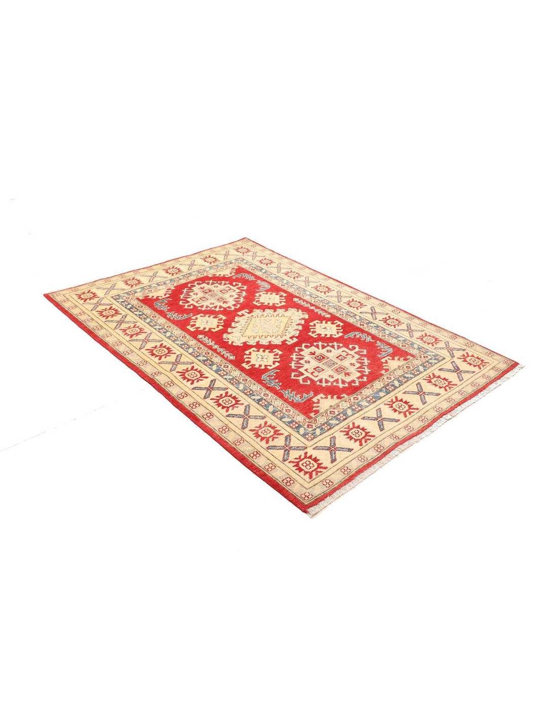 Kazak Pakistan rugs are characterized by their bold geometric designs, often featuring central medallions and borders in vivid colors such as red, blue, ivory, and green. These patterns stem from Caucasian tradition but are reinterpreted with the precision and artistry typical of Pakistani craftsmanship. Thanks to their durability and aesthetic appeal, they are ideal for enriching both classic and modern interiors, adding warmth and character.