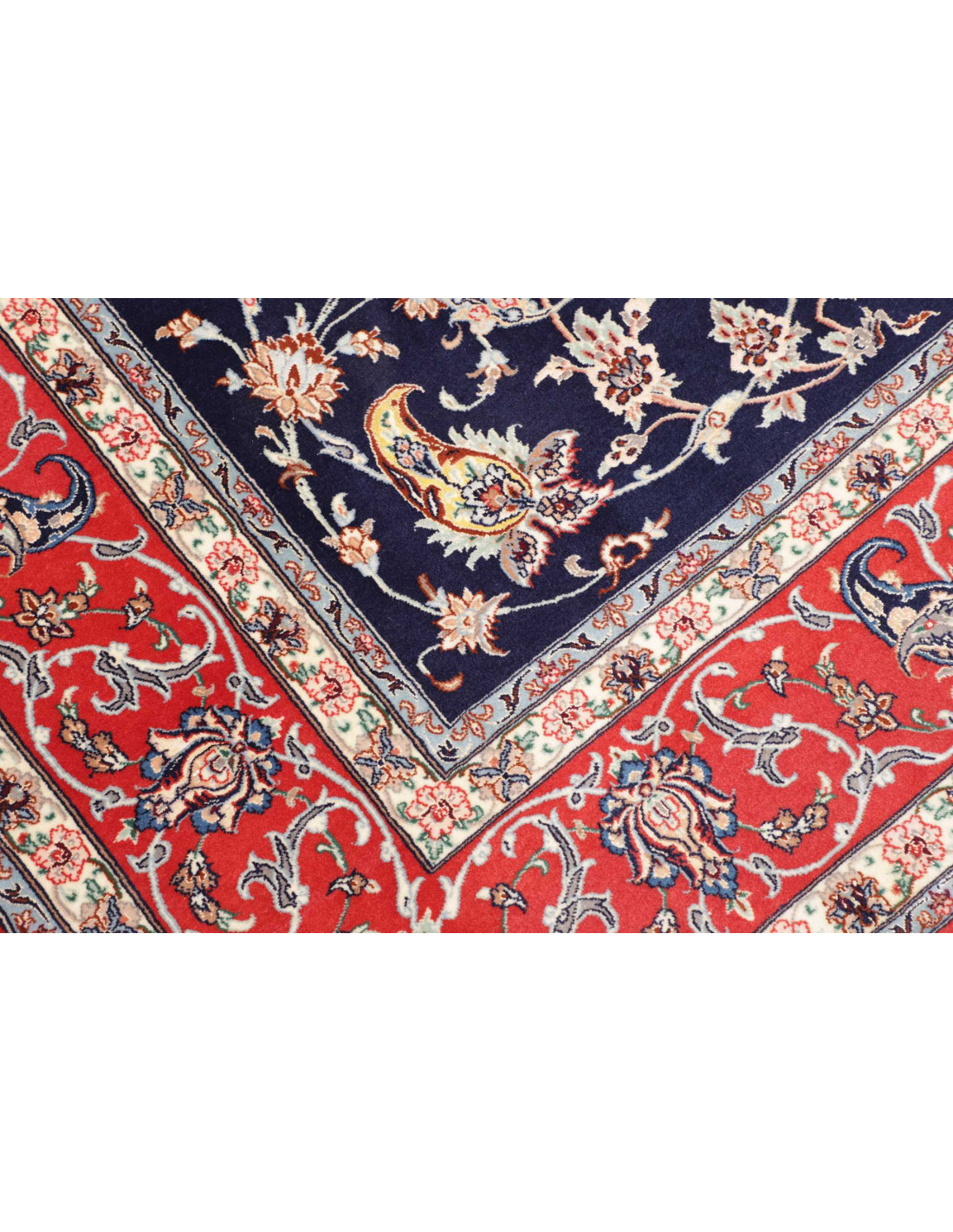 The colour palette of Isfahan rugs is refined and elegant. Ivory, cream and light beige dominate the background, accented by shades of indigo blue, soft turquoise, and deep crimson. The careful balance of colours creates a sense of sophistication and timeless beauty, making these rugs suitable for both classical and contemporary interiors.