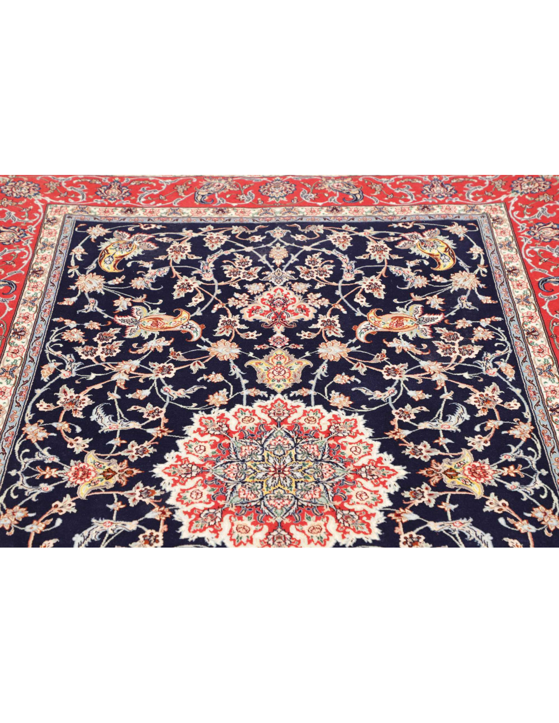 Isfahan rugs are characterised by their extremely fine knotting. They are typically woven on a silk or cotton foundation, with wool pile of the highest quality, often enriched with pure silk highlights. Knot densities range from 600,000 to over 1,000,000 knots per square metre, allowing the weavers to achieve extraordinary precision and detail. The surface is smooth and delicate, almost resembling a painting in thread.
