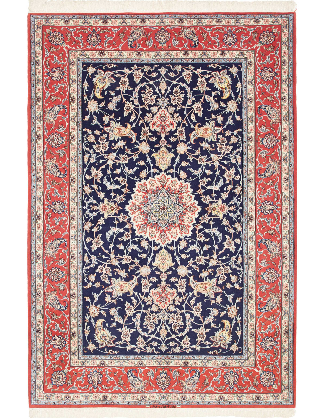The most distinguishing feature of Isfahan rugs is their exquisite design. They often display a central medallion set within an open field, surrounded by intricate arabesques, delicate vine scrolls, and finely detailed floral motifs. Many designs are inspired by the tilework and architecture of Isfahan’s mosques and palaces, especially the Shah Mosque and the Chehel Sotoun. The borders are elaborately decorated, creating perfect symmetry and harmony across the surface.
