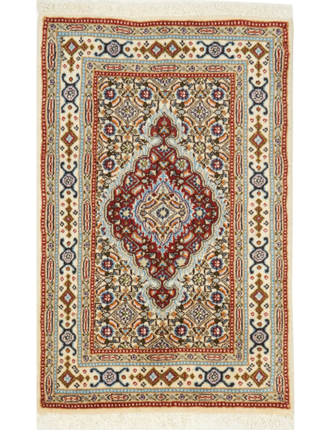 Aesthetically, Moud rugs are distinguished by their refined floral and geometric designs, often arranged around a central medallion or woven in an all-over “Herati” pattern. Common colors include blue, red, and ivory, frequently combined with beige and light brown to create a balanced, luminous palette. Thanks to their high knot density, the motifs appear crisp and detailed, making these rugs highly prized in both classic and contemporary interiors.
