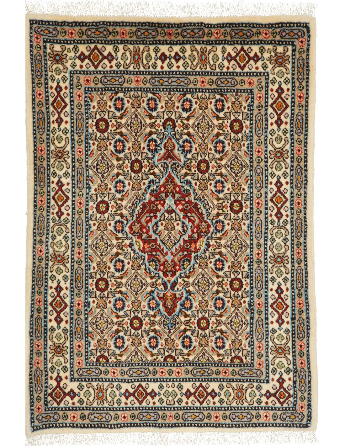 Aesthetically, Moud rugs are distinguished by their refined floral and geometric designs, often arranged around a central medallion or woven in an all-over “Herati” pattern. Common colors include blue, red, and ivory, frequently combined with beige and light brown to create a balanced, luminous palette. Thanks to their high knot density, the motifs appear crisp and detailed, making these rugs highly prized in both classic and contemporary interiors.