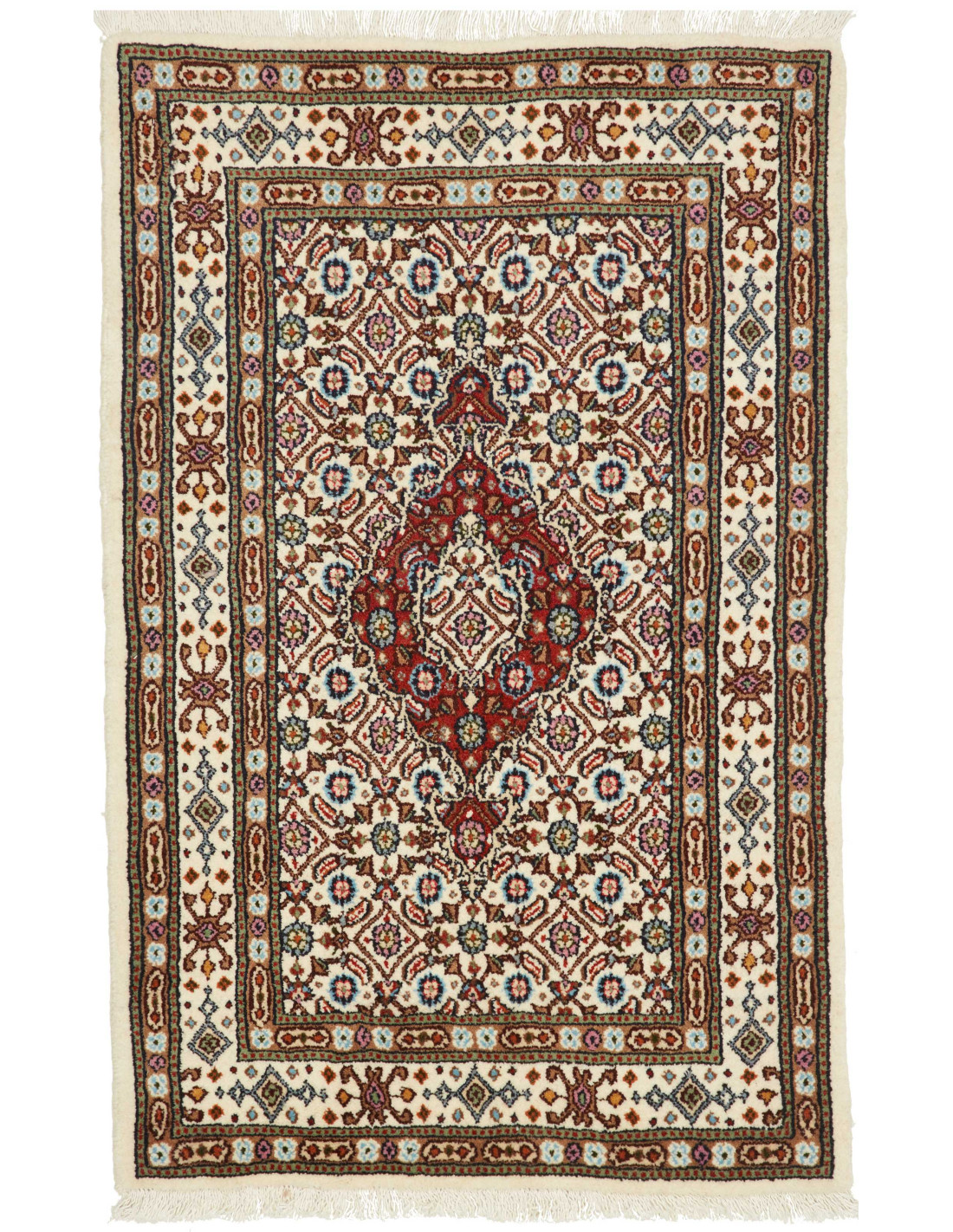 Aesthetically, Moud rugs are distinguished by their refined floral and geometric designs, often arranged around a central medallion or woven in an all-over “Herati” pattern. Common colors include blue, red, and ivory, frequently combined with beige and light brown to create a balanced, luminous palette. Thanks to their high knot density, the motifs appear crisp and detailed, making these rugs highly prized in both classic and contemporary interiors.