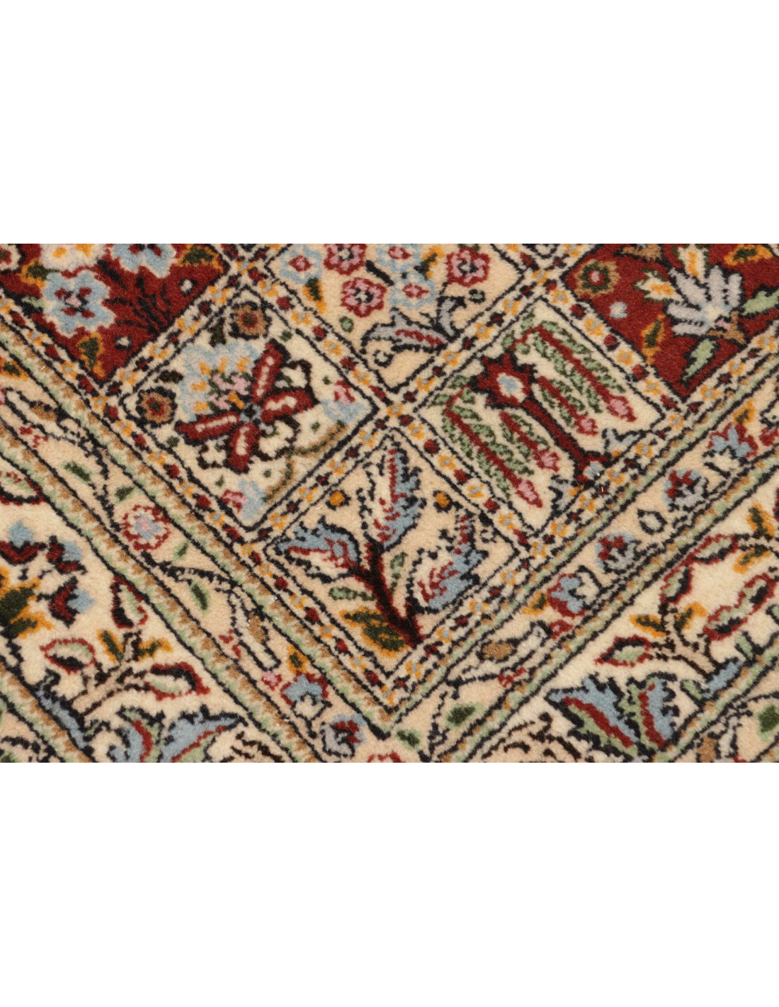 Aesthetically, Moud rugs are distinguished by their refined floral and geometric designs, often arranged around a central medallion or woven in an all-over “Herati” pattern. Common colors include blue, red, and ivory, frequently combined with beige and light brown to create a balanced, luminous palette. Thanks to their high knot density, the motifs appear crisp and detailed, making these rugs highly prized in both classic and contemporary interiors.