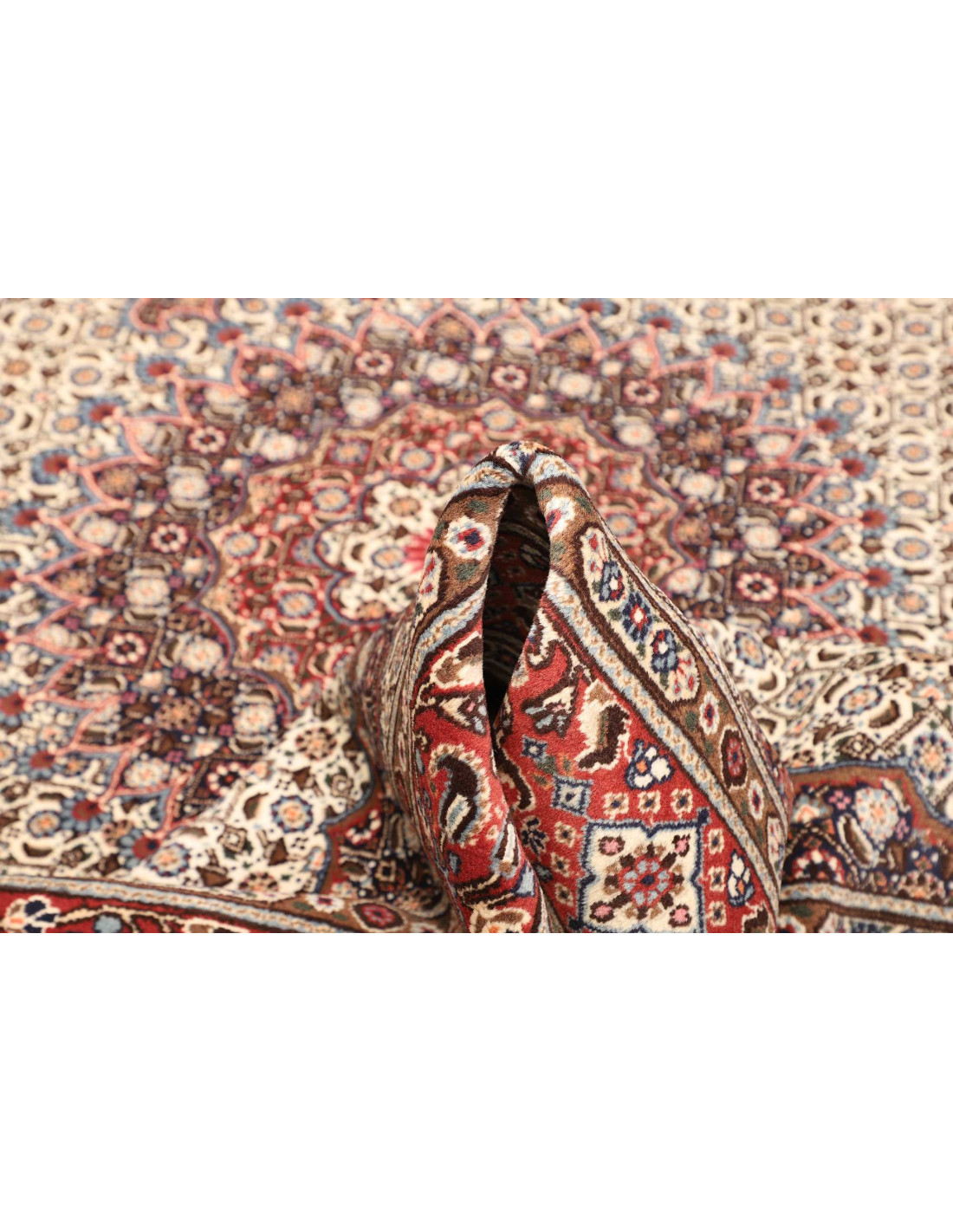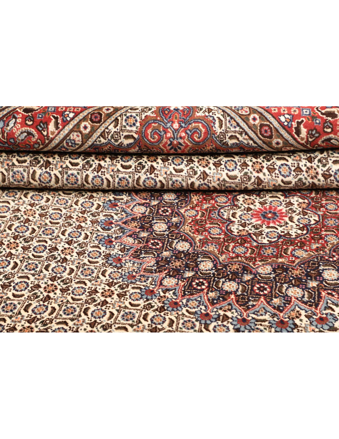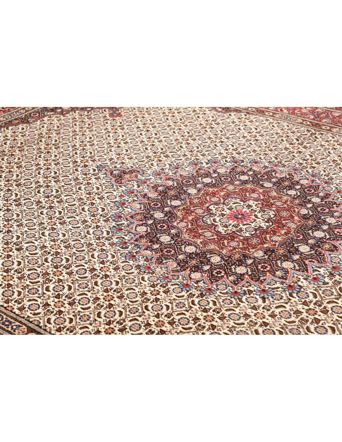 Aesthetically, Moud rugs are distinguished by their refined floral and geometric designs, often arranged around a central medallion or woven in an all-over “Herati” pattern. Common colors include blue, red, and ivory, frequently combined with beige and light brown to create a balanced, luminous palette. Thanks to their high knot density, the motifs appear crisp and detailed, making these rugs highly prized in both classic and contemporary interiors.