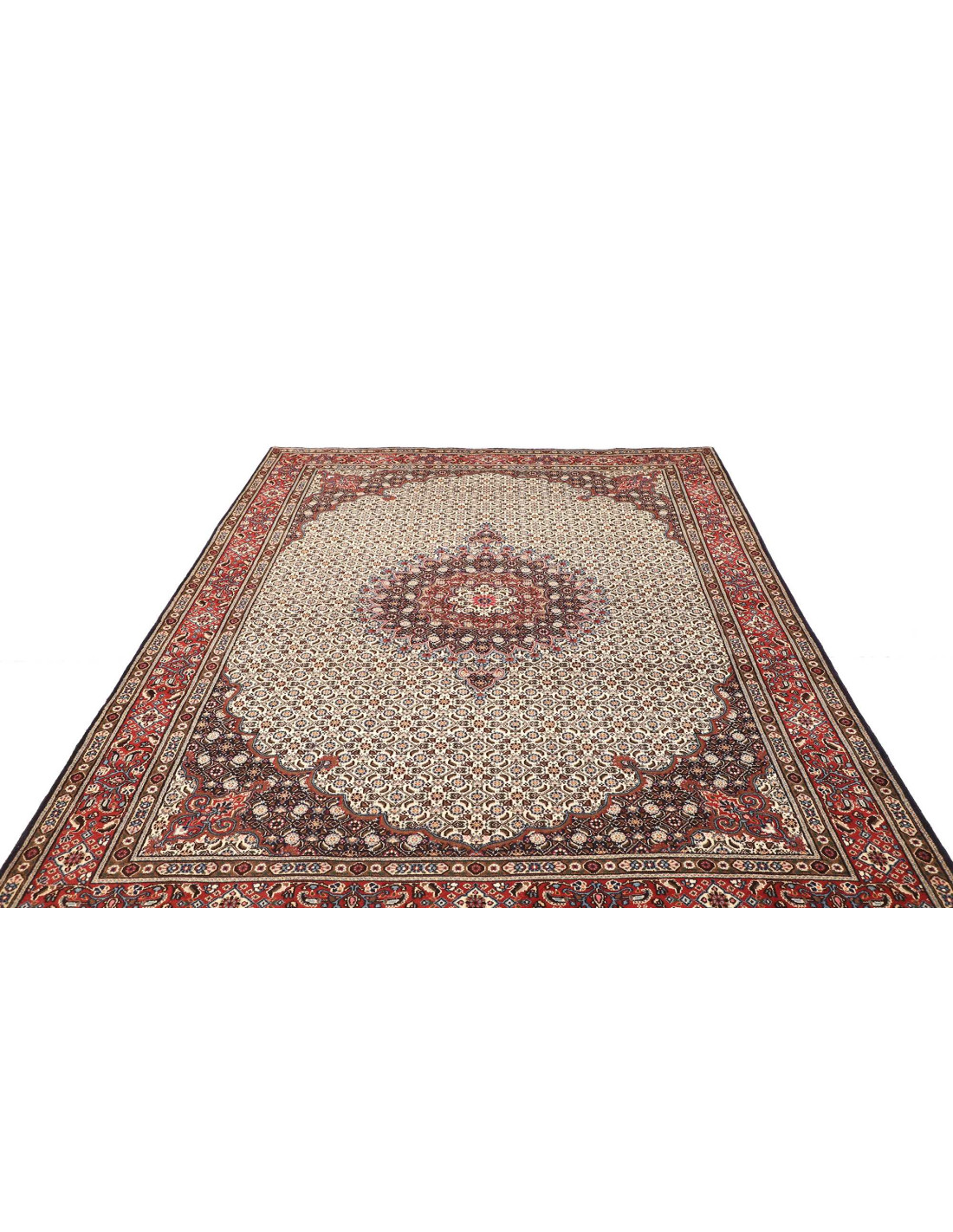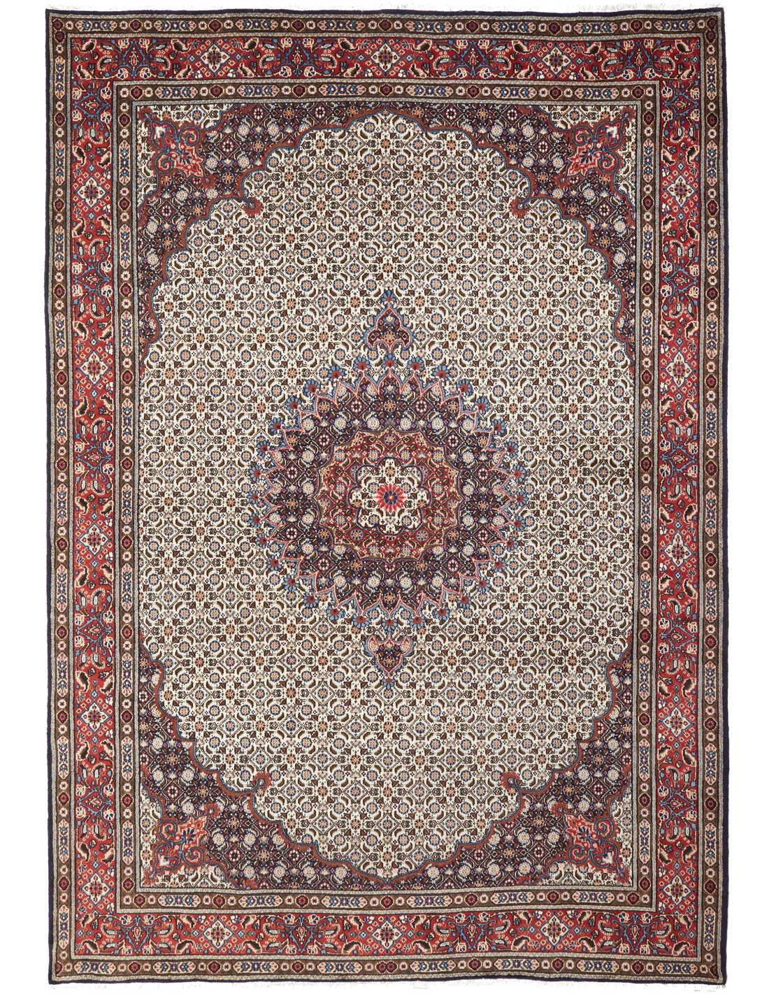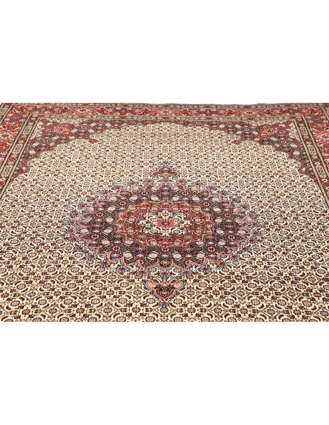 Aesthetically, Moud rugs are distinguished by their refined floral and geometric designs, often arranged around a central medallion or woven in an all-over “Herati” pattern. Common colors include blue, red, and ivory, frequently combined with beige and light brown to create a balanced, luminous palette. Thanks to their high knot density, the motifs appear crisp and detailed, making these rugs highly prized in both classic and contemporary interiors.