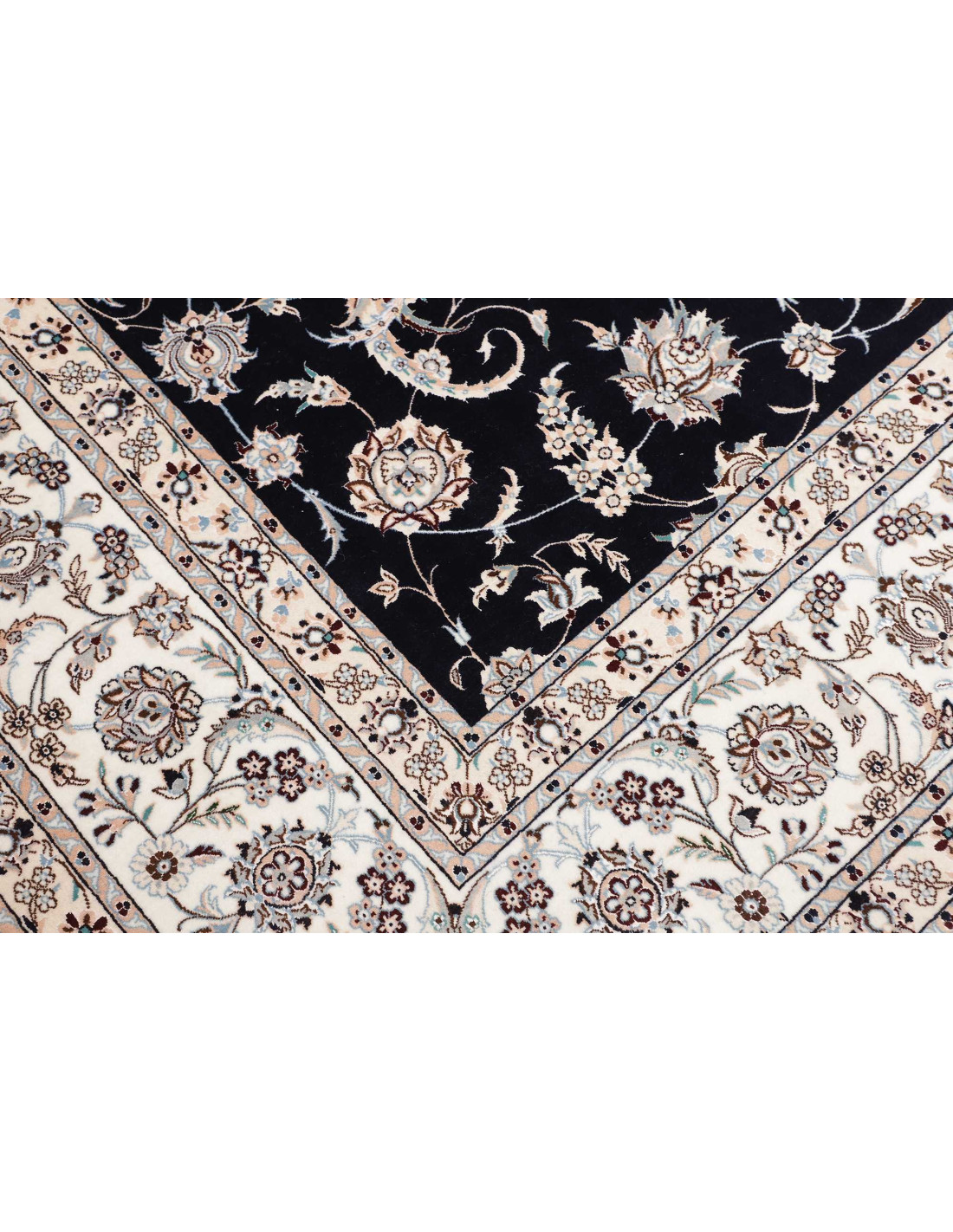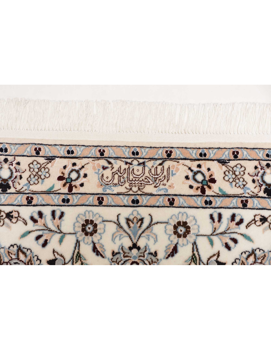Nain 6La rugs are admired for their rich and intricate floral designs, often featuring elegant central medallions, delicate arabesques, and elaborate borders. Their dominant palette includes light and sophisticated tones such as ivory, beige, and blue, enhanced by harmonious contrasts that highlight the silk’s brilliance. The “6-ply” (6La) structure indicates a higher fineness in knotting compared to other Nain qualities, making these rugs particularly valuable and sought after.