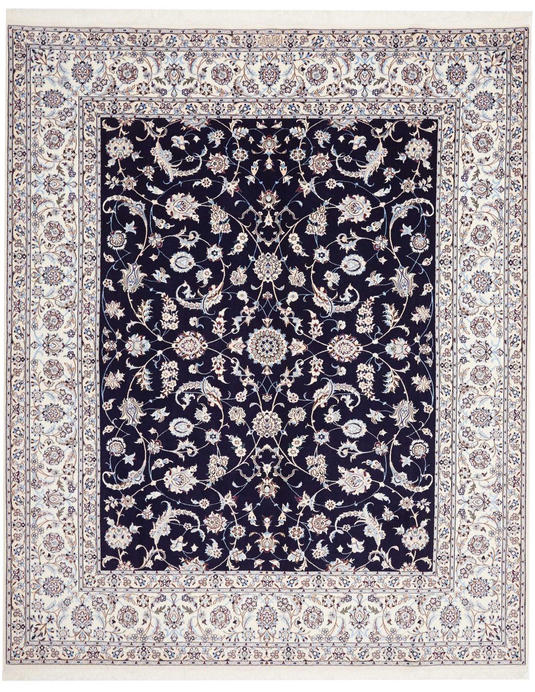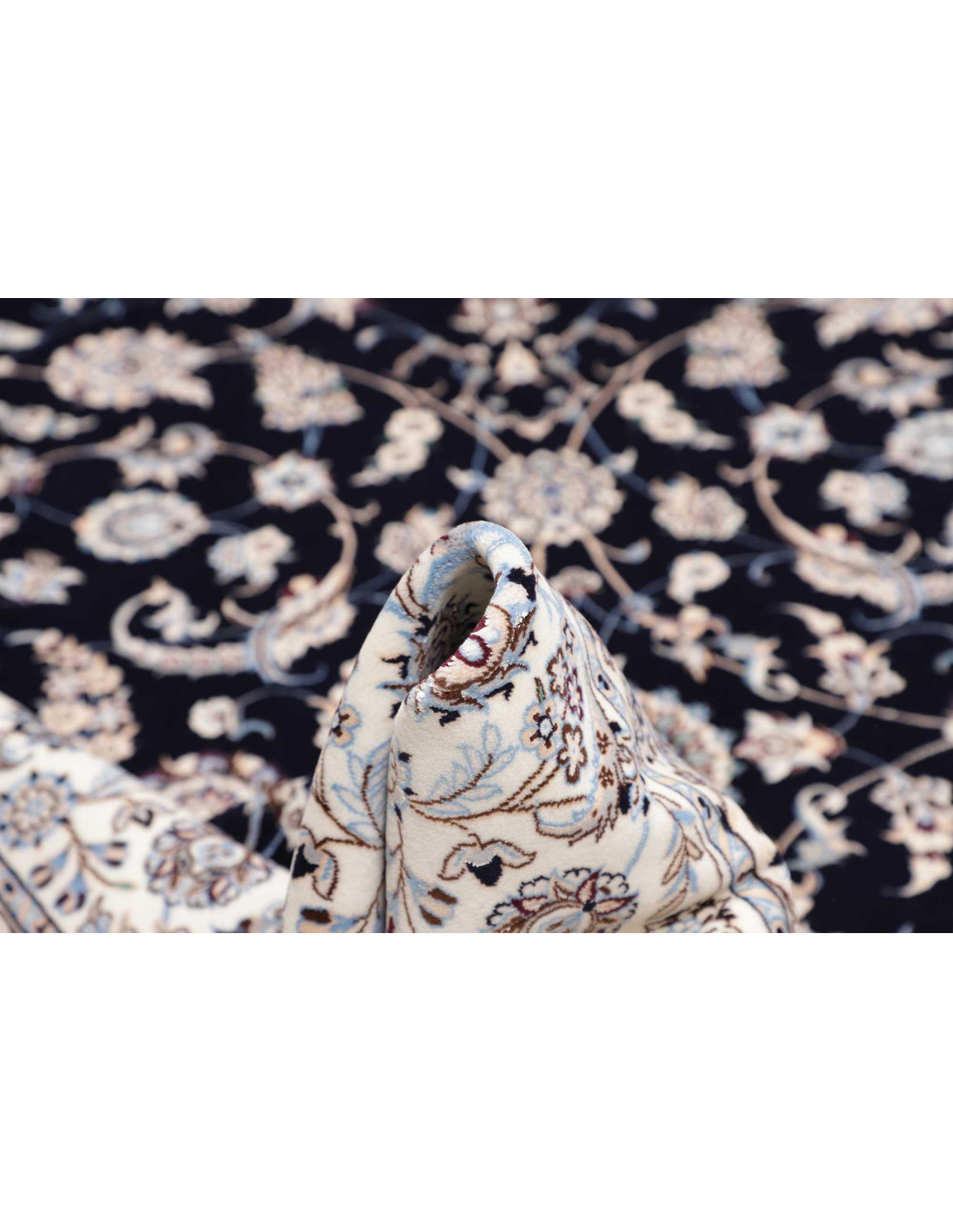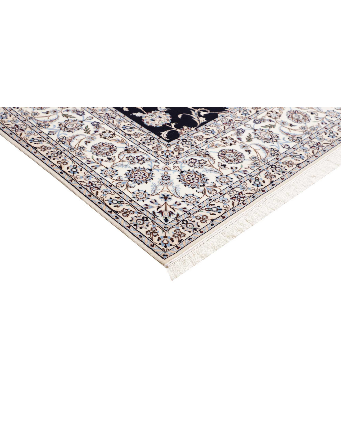 Nain 6La rugs are admired for their rich and intricate floral designs, often featuring elegant central medallions, delicate arabesques, and elaborate borders. Their dominant palette includes light and sophisticated tones such as ivory, beige, and blue, enhanced by harmonious contrasts that highlight the silk’s brilliance. The “6-ply” (6La) structure indicates a higher fineness in knotting compared to other Nain qualities, making these rugs particularly valuable and sought after.