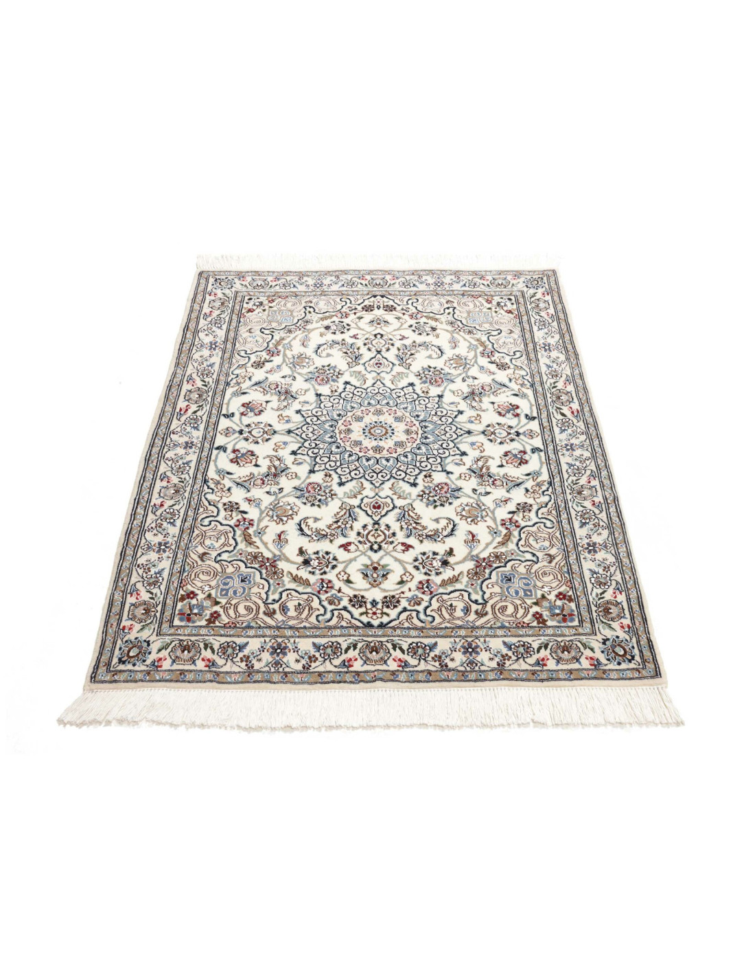 Aesthetically, Nain 9La rugs are characterized by their delicate floral motifs and arabesques, often arranged around a central medallion and framed by harmonious borders. Their dominant palette includes refined shades of ivory, beige, and blue, with soft contrasts that give the rug a luminous and elegant appearance. The term “9La” refers to the use of slightly thicker threads compared to Nain 6La rugs, ensuring outstanding quality while offering a more accessible option, without sacrificing timeless beauty.