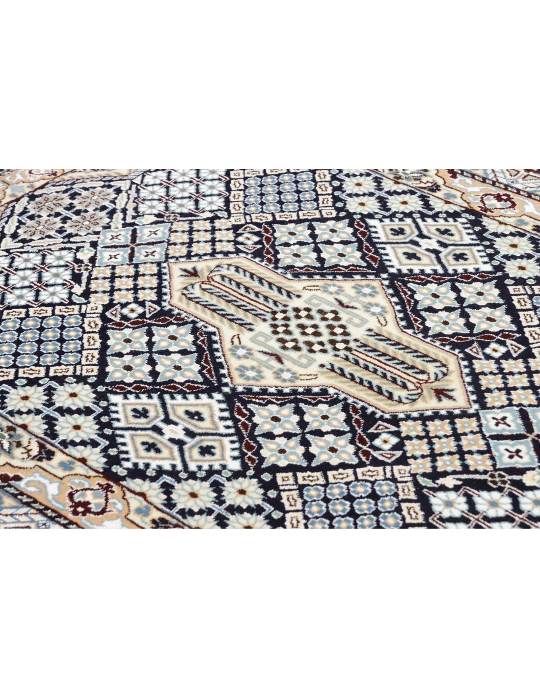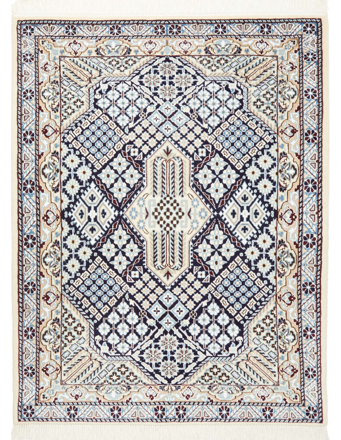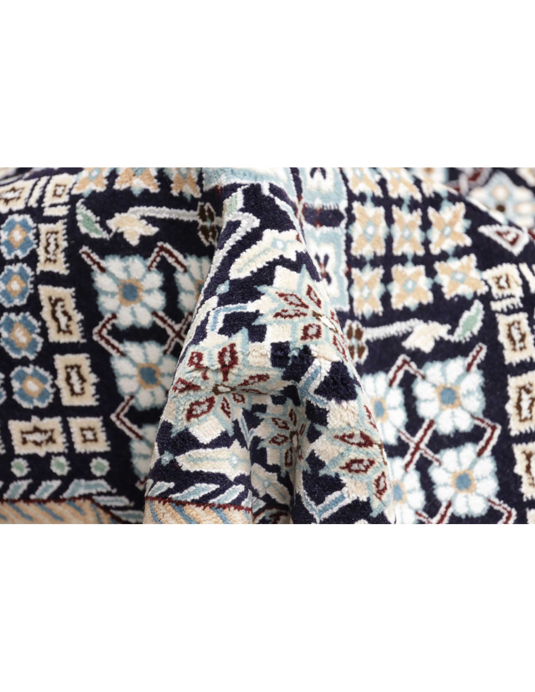 Aesthetically, Nain 9La rugs are characterized by their delicate floral motifs and arabesques, often arranged around a central medallion and framed by harmonious borders. Their dominant palette includes refined shades of ivory, beige, and blue, with soft contrasts that give the rug a luminous and elegant appearance. The term “9La” refers to the use of slightly thicker threads compared to Nain 6La rugs, ensuring outstanding quality while offering a more accessible option, without sacrificing timeless beauty.