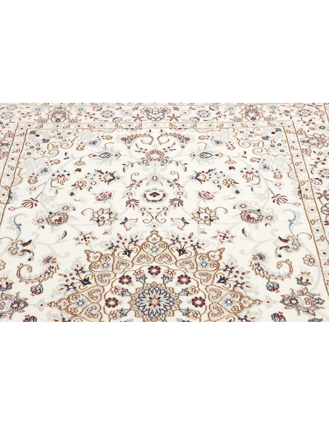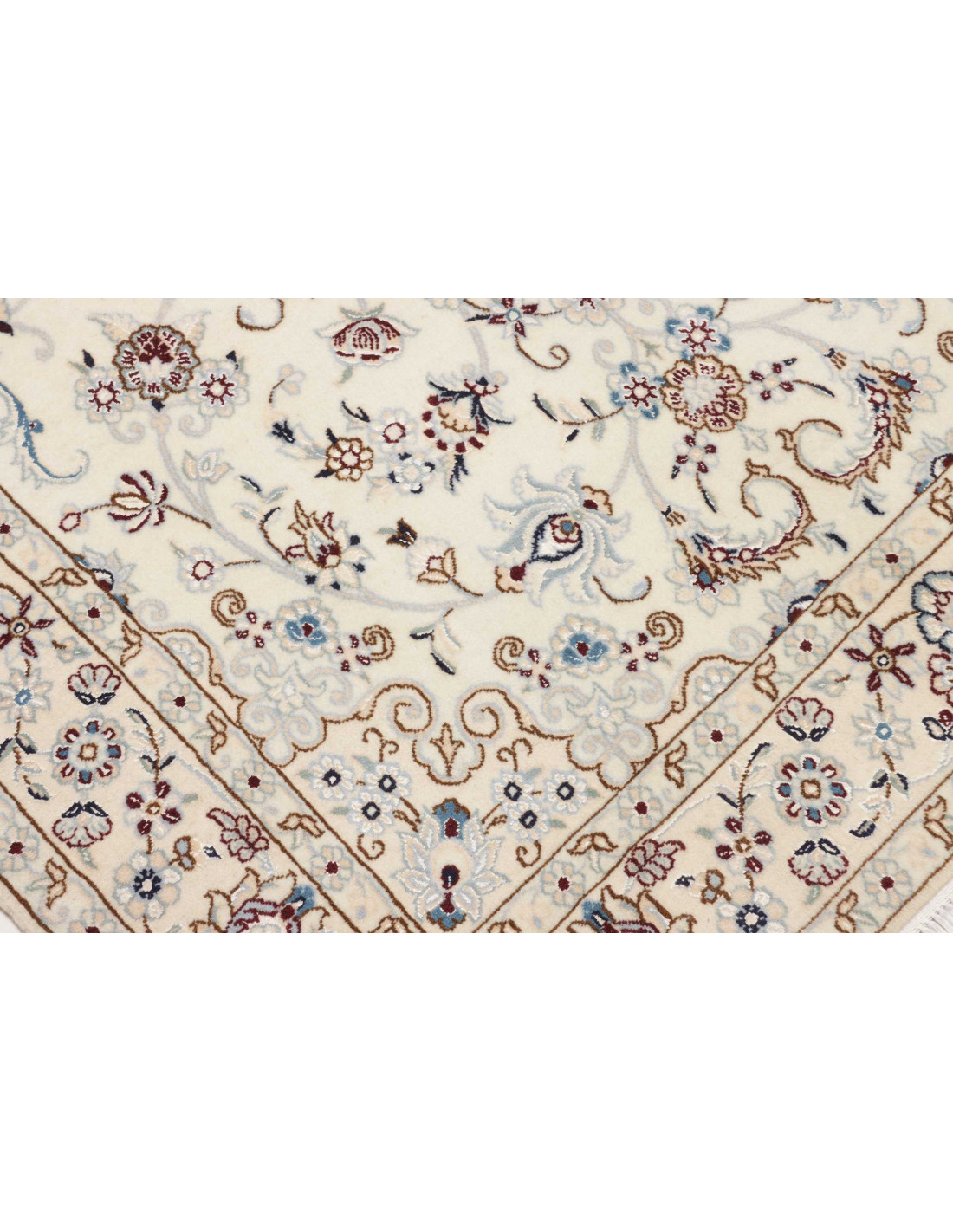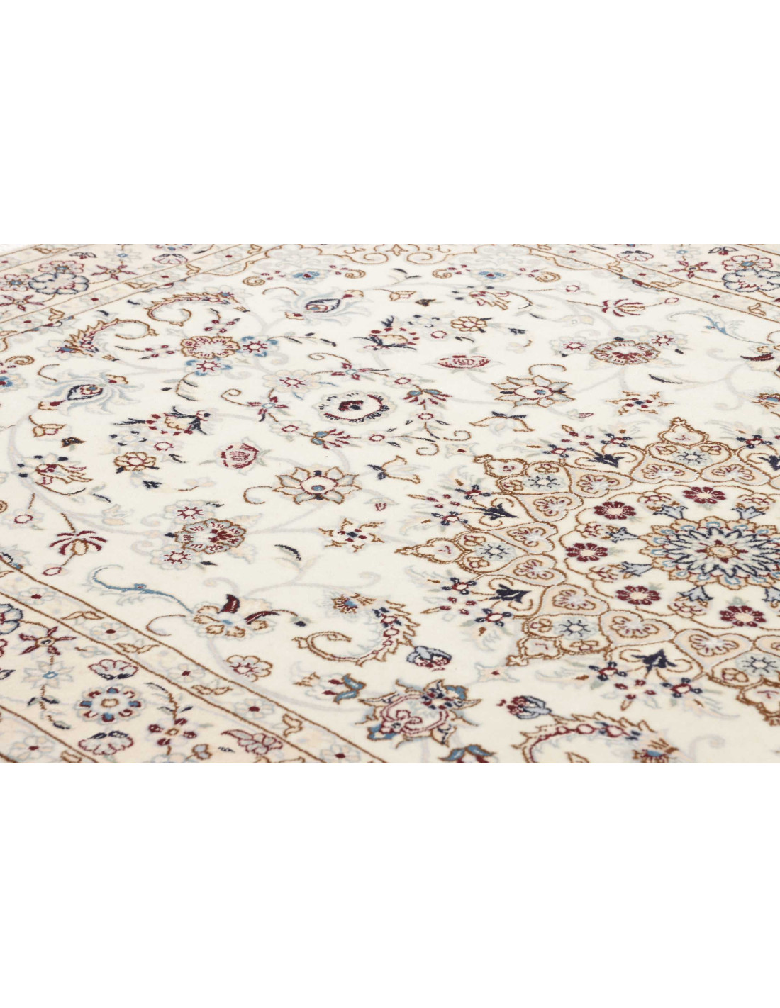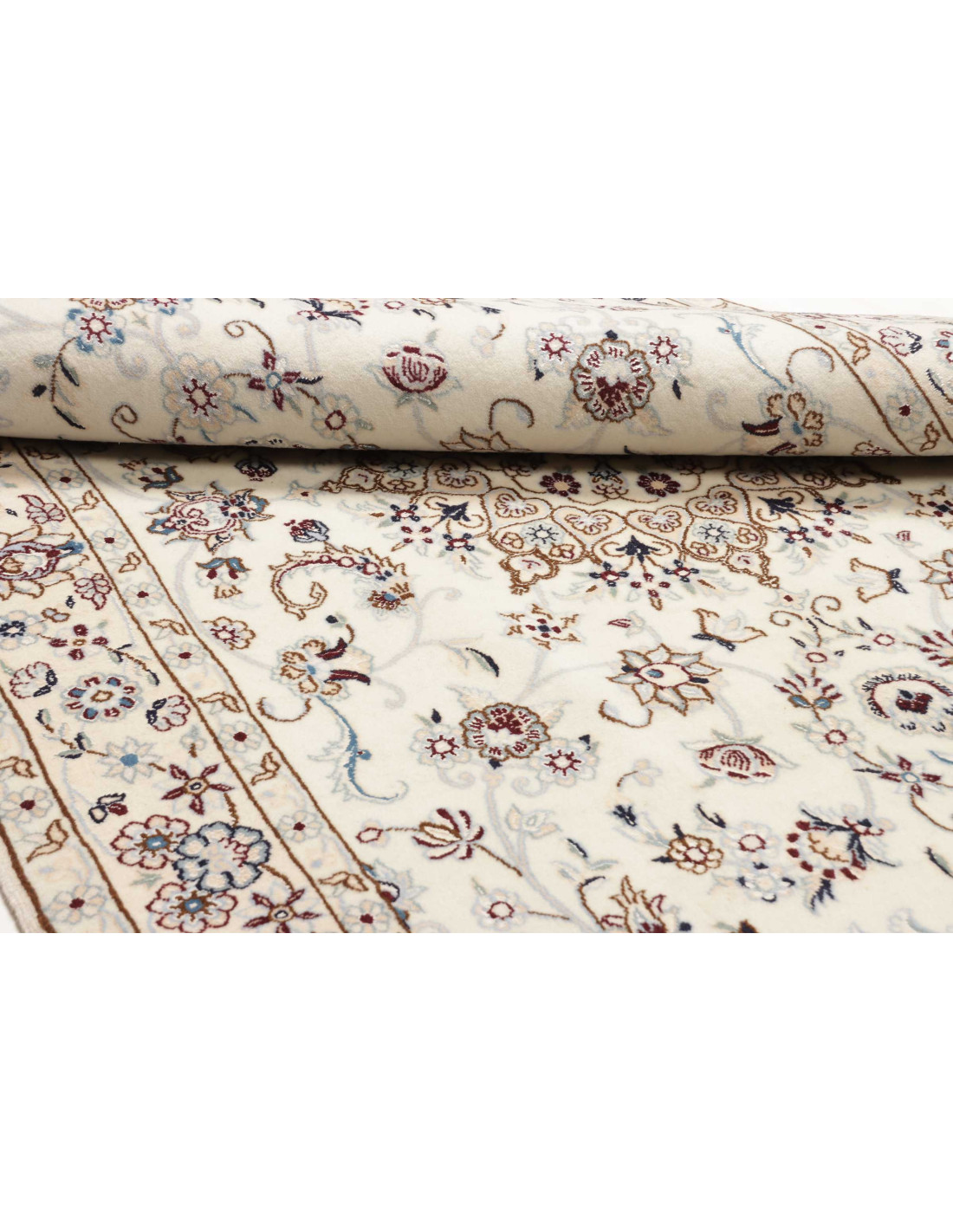 Aesthetically, Nain 9La rugs are characterized by their delicate floral motifs and arabesques, often arranged around a central medallion and framed by harmonious borders. Their dominant palette includes refined shades of ivory, beige, and blue, with soft contrasts that give the rug a luminous and elegant appearance. The term “9La” refers to the use of slightly thicker threads compared to Nain 6La rugs, ensuring outstanding quality while offering a more accessible option, without sacrificing timeless beauty.