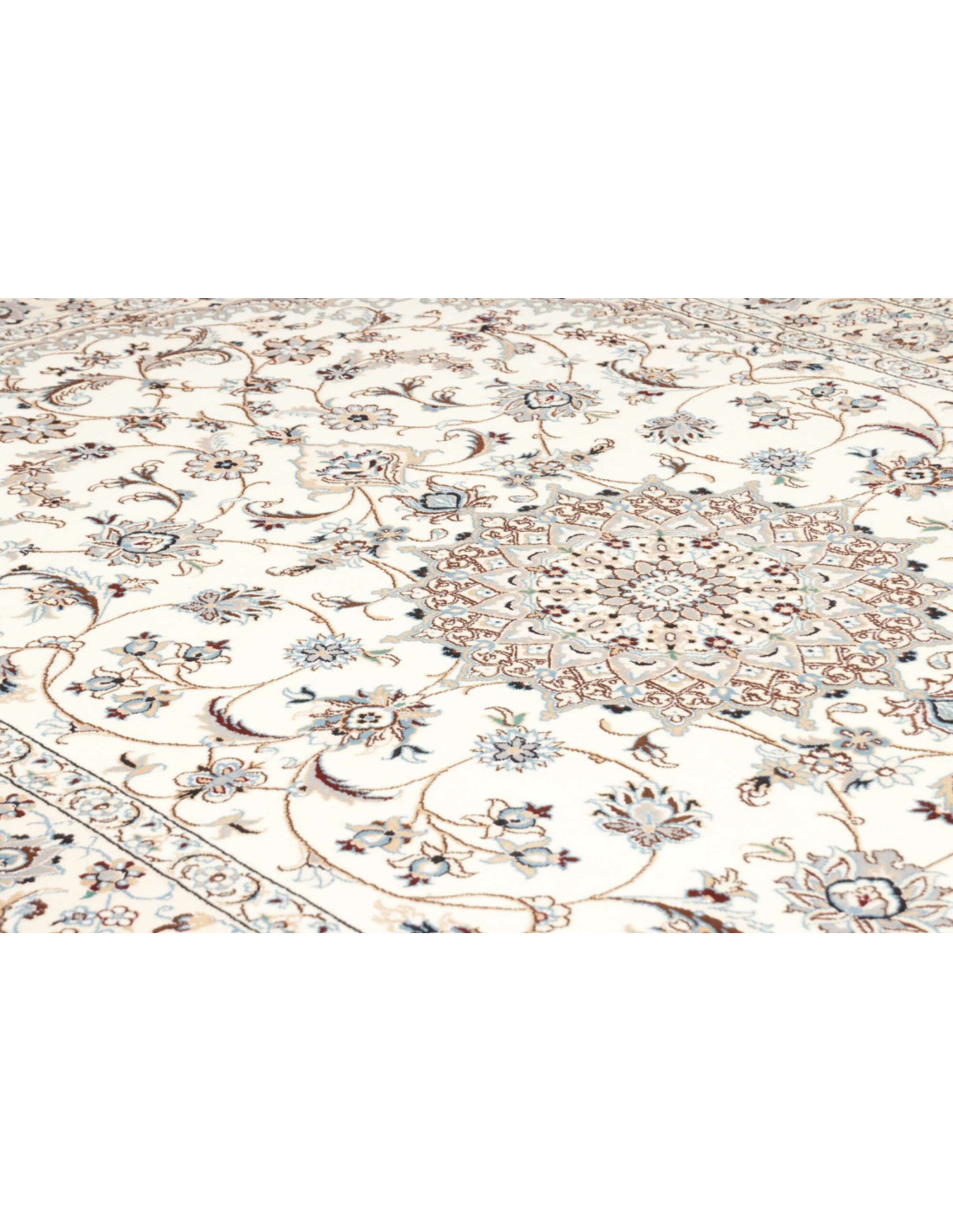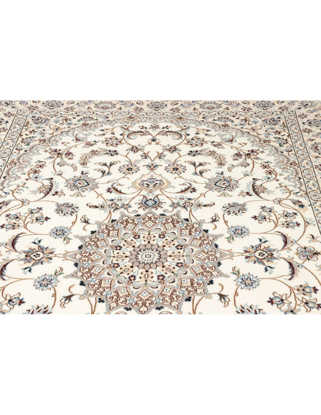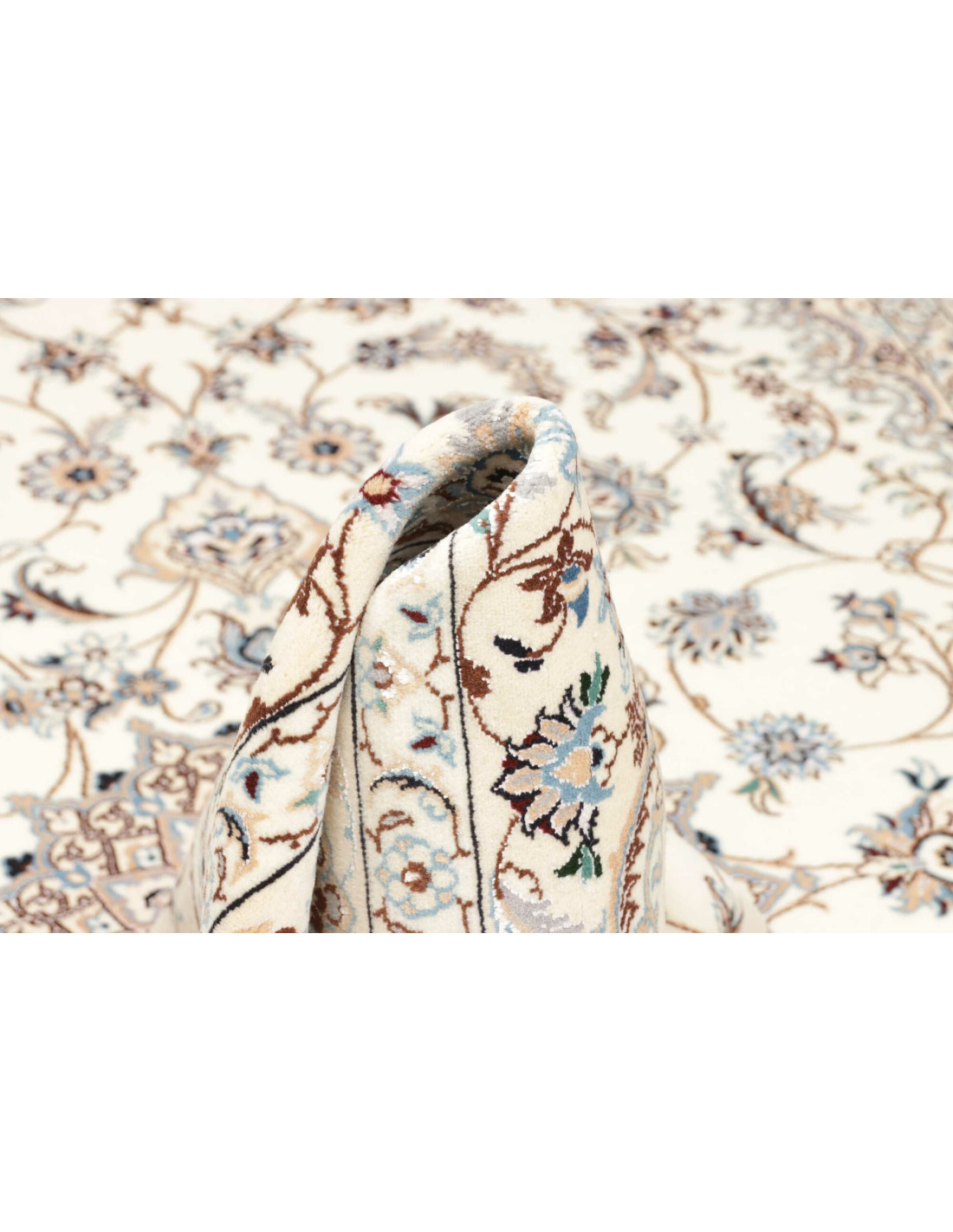 Aesthetically, Nain 9La rugs are characterized by their delicate floral motifs and arabesques, often arranged around a central medallion and framed by harmonious borders. Their dominant palette includes refined shades of ivory, beige, and blue, with soft contrasts that give the rug a luminous and elegant appearance. The term “9La” refers to the use of slightly thicker threads compared to Nain 6La rugs, ensuring outstanding quality while offering a more accessible option, without sacrificing timeless beauty.