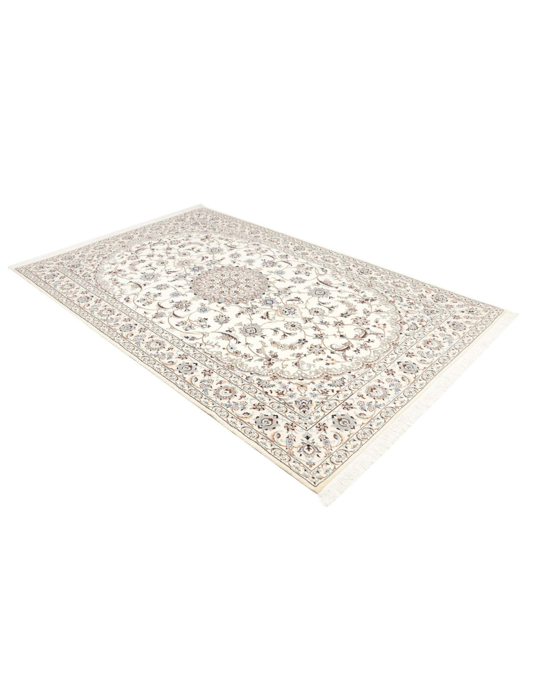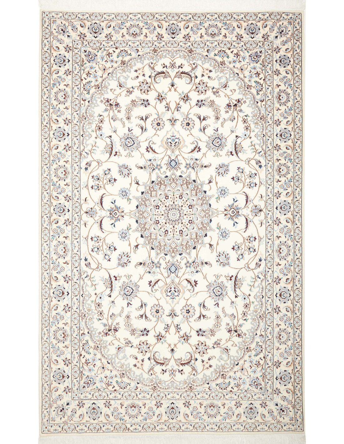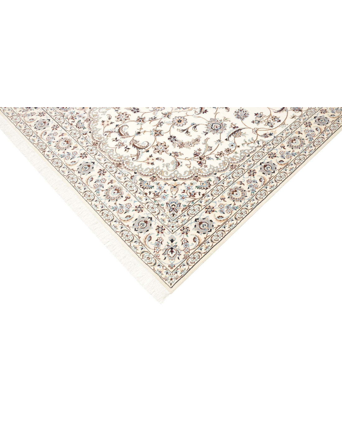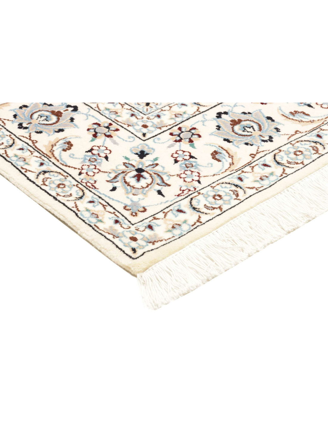 Aesthetically, Nain 9La rugs are characterized by their delicate floral motifs and arabesques, often arranged around a central medallion and framed by harmonious borders. Their dominant palette includes refined shades of ivory, beige, and blue, with soft contrasts that give the rug a luminous and elegant appearance. The term “9La” refers to the use of slightly thicker threads compared to Nain 6La rugs, ensuring outstanding quality while offering a more accessible option, without sacrificing timeless beauty.