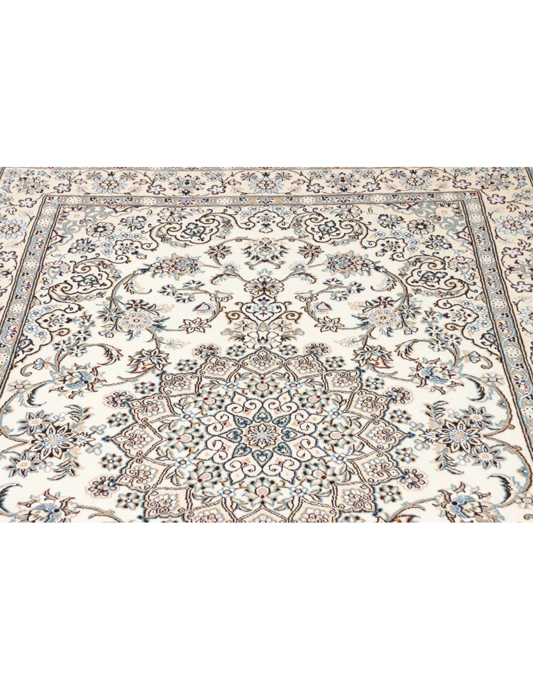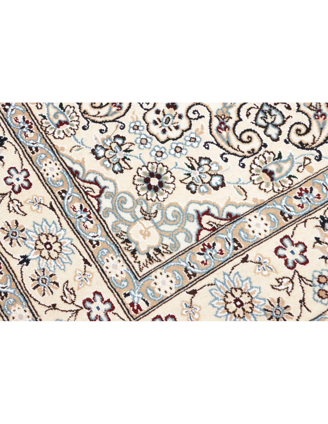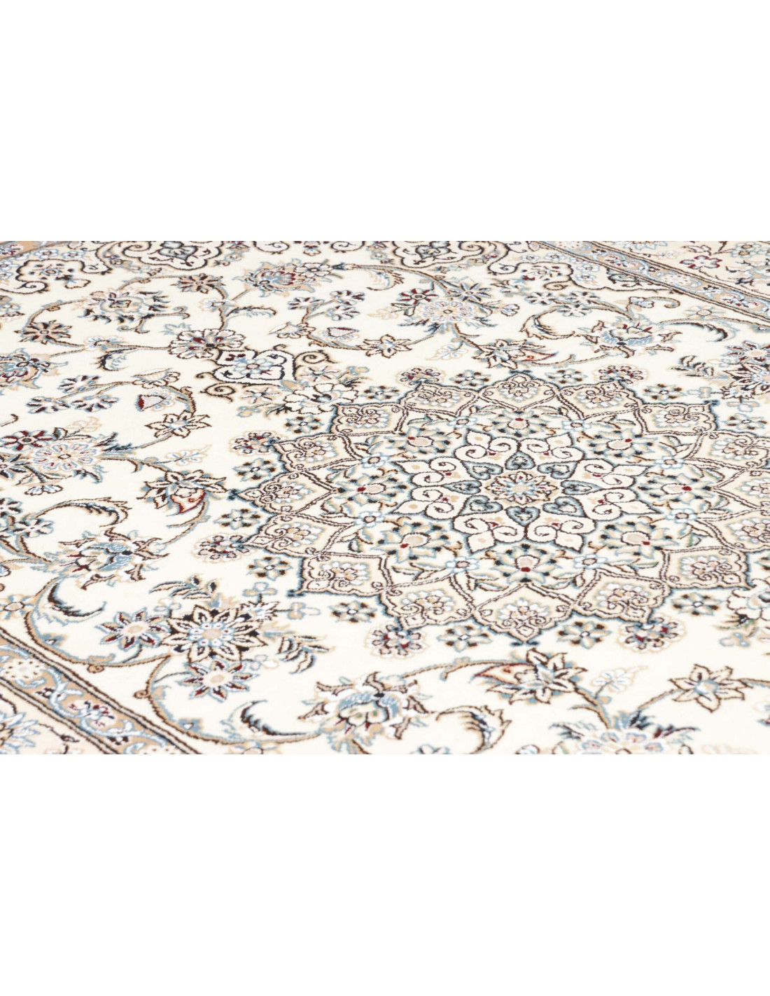 Aesthetically, Nain 9La rugs are characterized by their delicate floral motifs and arabesques, often arranged around a central medallion and framed by harmonious borders. Their dominant palette includes refined shades of ivory, beige, and blue, with soft contrasts that give the rug a luminous and elegant appearance. The term “9La” refers to the use of slightly thicker threads compared to Nain 6La rugs, ensuring outstanding quality while offering a more accessible option, without sacrificing timeless beauty.