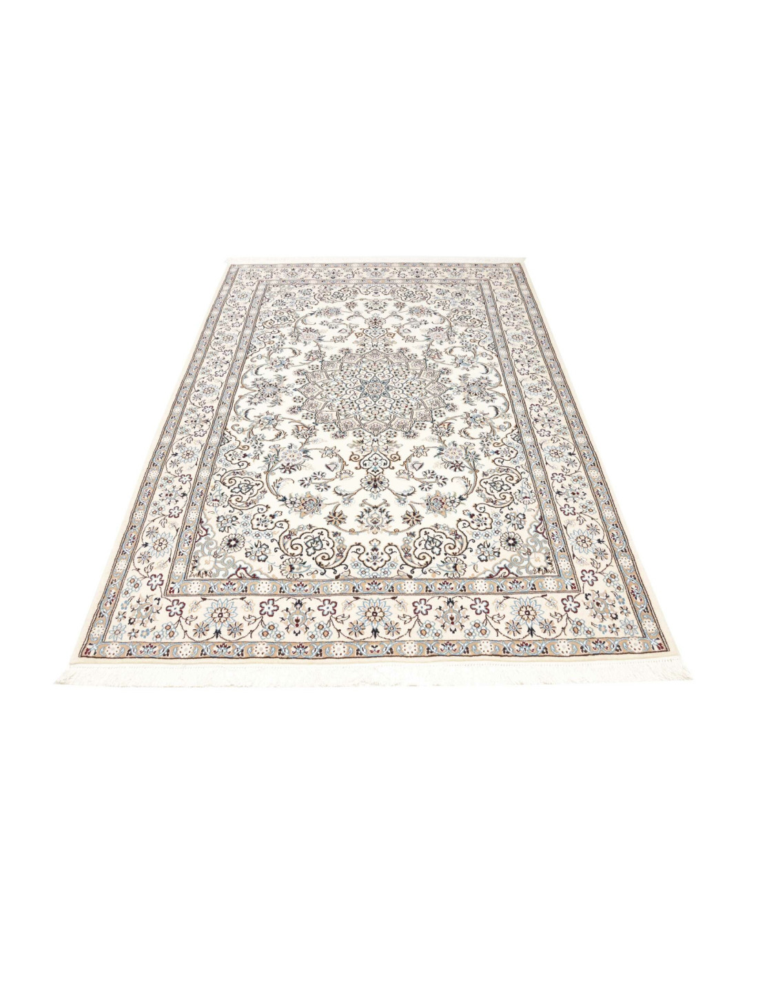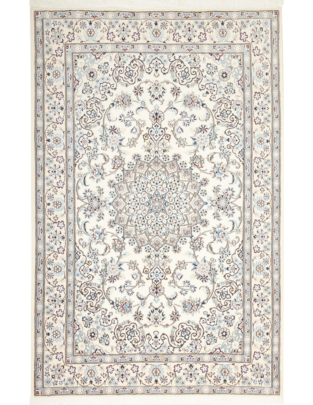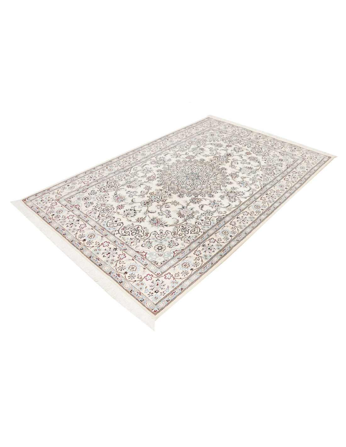 Aesthetically, Nain 9La rugs are characterized by their delicate floral motifs and arabesques, often arranged around a central medallion and framed by harmonious borders. Their dominant palette includes refined shades of ivory, beige, and blue, with soft contrasts that give the rug a luminous and elegant appearance. The term “9La” refers to the use of slightly thicker threads compared to Nain 6La rugs, ensuring outstanding quality while offering a more accessible option, without sacrificing timeless beauty.