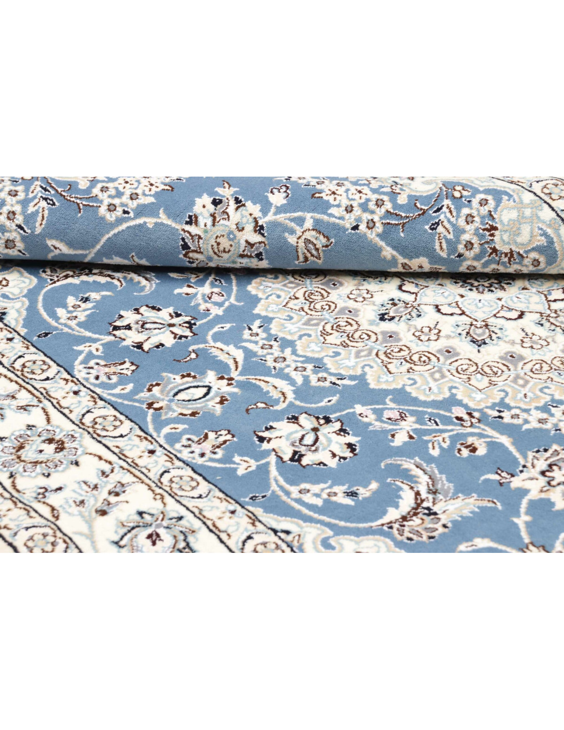 Aesthetically, Nain 9La rugs are characterized by their delicate floral motifs and arabesques, often arranged around a central medallion and framed by harmonious borders. Their dominant palette includes refined shades of ivory, beige, and blue, with soft contrasts that give the rug a luminous and elegant appearance. The term “9La” refers to the use of slightly thicker threads compared to Nain 6La rugs, ensuring outstanding quality while offering a more accessible option, without sacrificing timeless beauty.