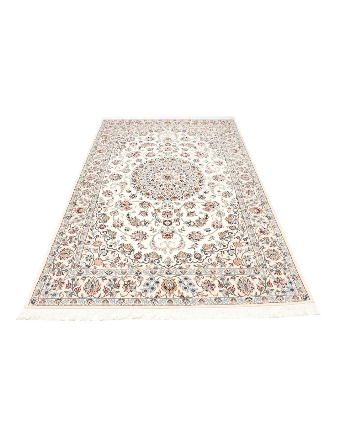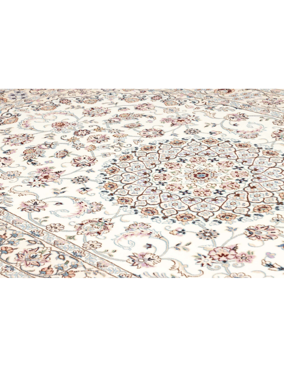 Aesthetically, Nain 9La rugs are characterized by their delicate floral motifs and arabesques, often arranged around a central medallion and framed by harmonious borders. Their dominant palette includes refined shades of ivory, beige, and blue, with soft contrasts that give the rug a luminous and elegant appearance. The term “9La” refers to the use of slightly thicker threads compared to Nain 6La rugs, ensuring outstanding quality while offering a more accessible option, without sacrificing timeless beauty.
