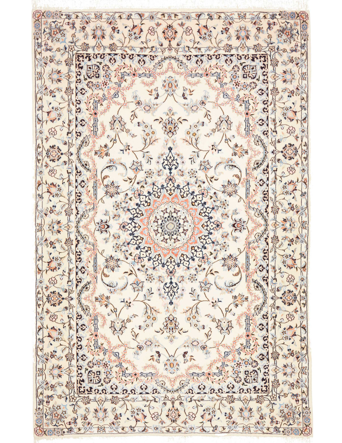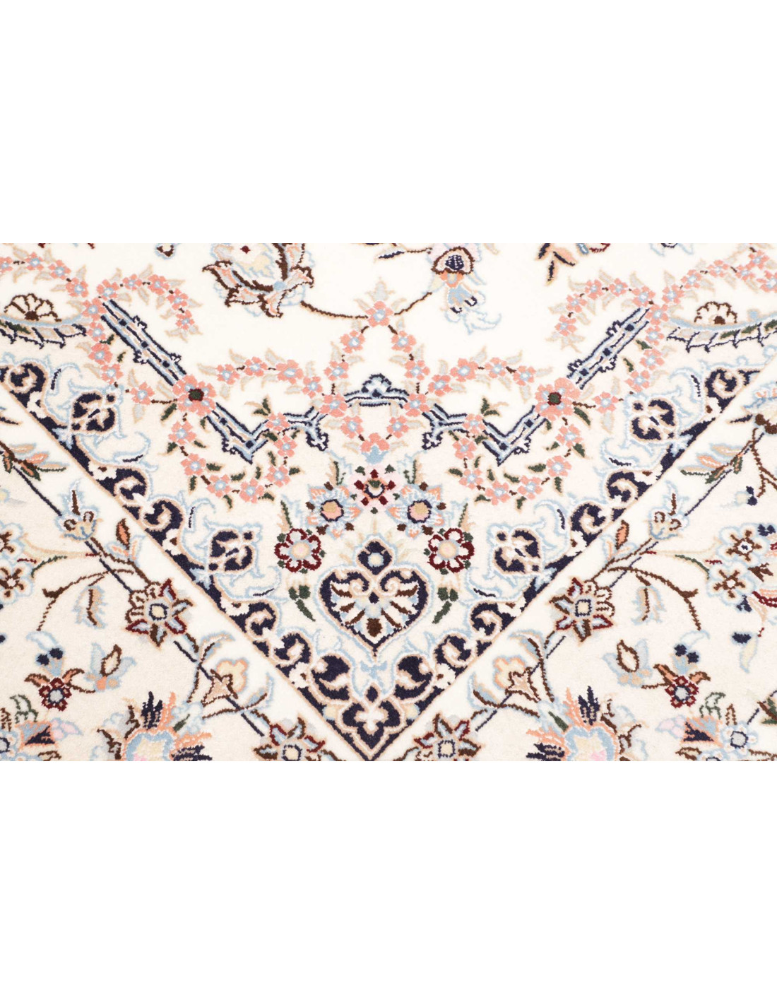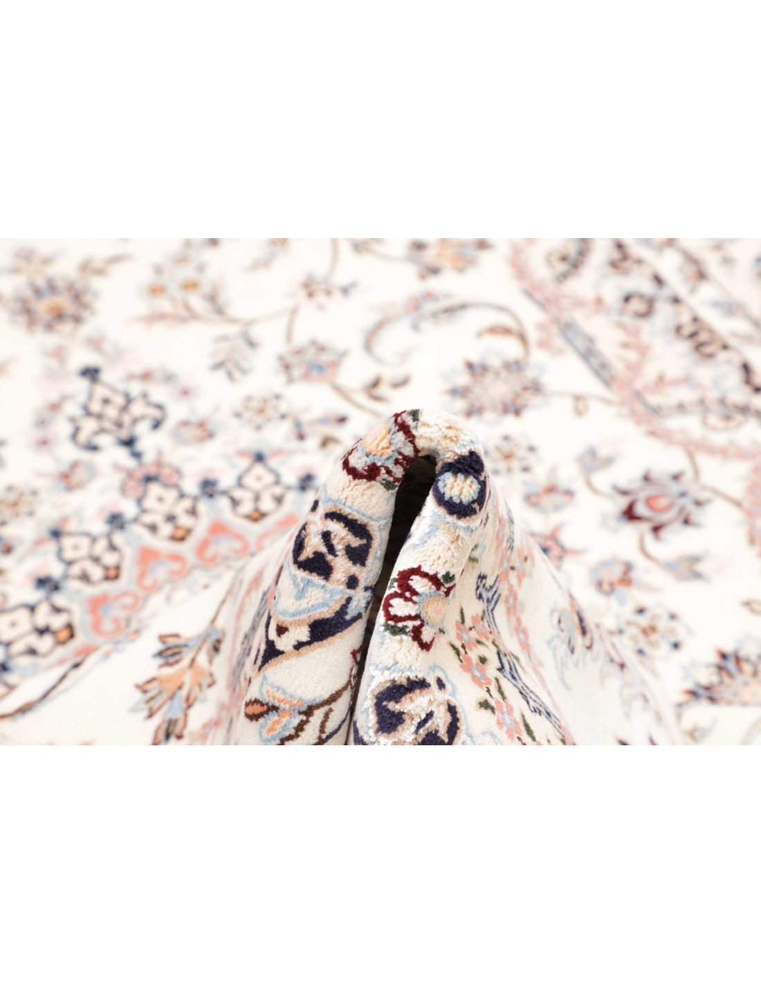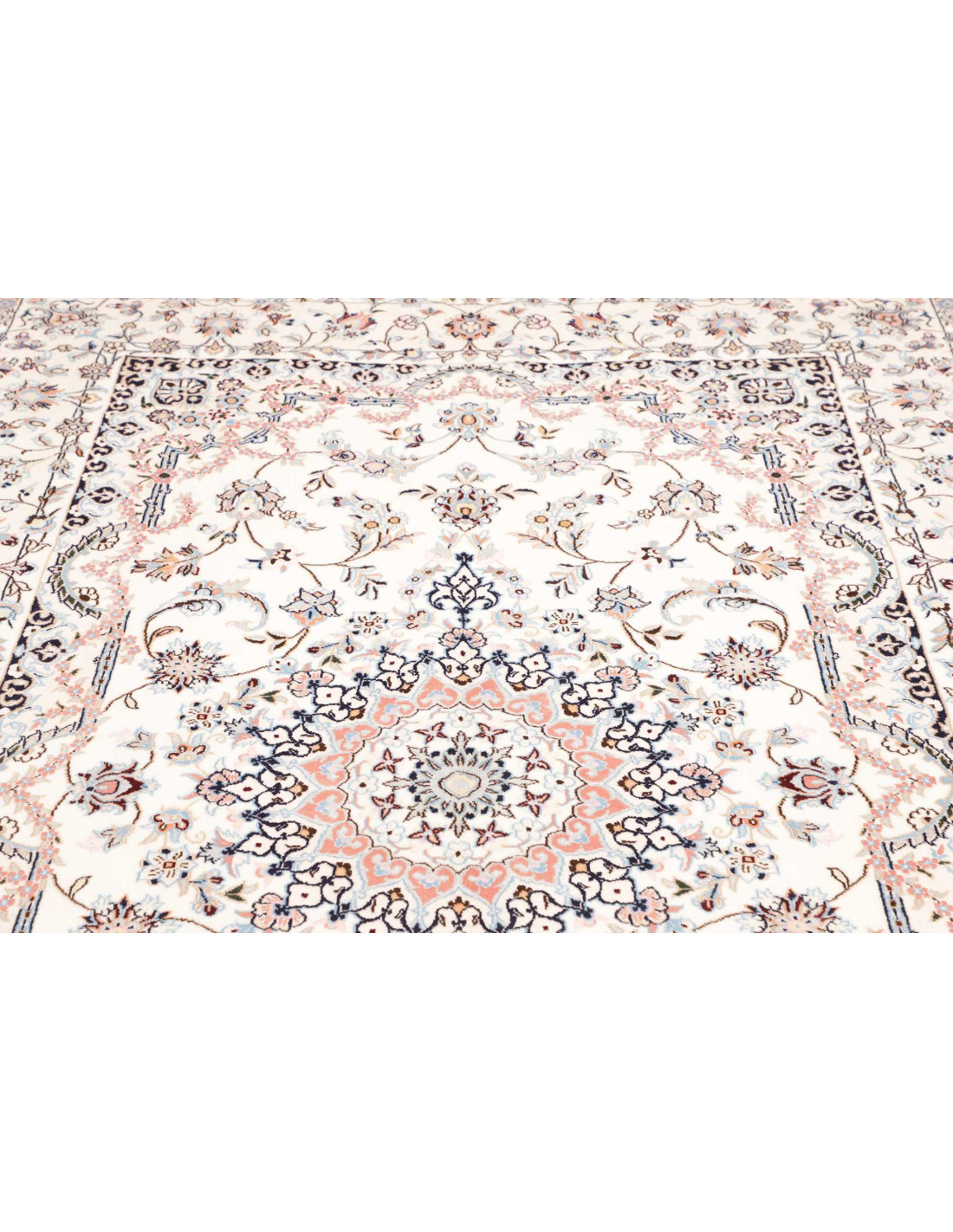 Aesthetically, Nain 9La rugs are characterized by their delicate floral motifs and arabesques, often arranged around a central medallion and framed by harmonious borders. Their dominant palette includes refined shades of ivory, beige, and blue, with soft contrasts that give the rug a luminous and elegant appearance. The term “9La” refers to the use of slightly thicker threads compared to Nain 6La rugs, ensuring outstanding quality while offering a more accessible option, without sacrificing timeless beauty.