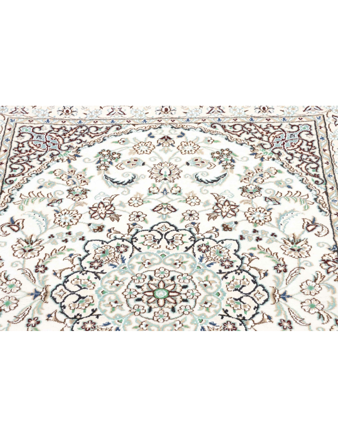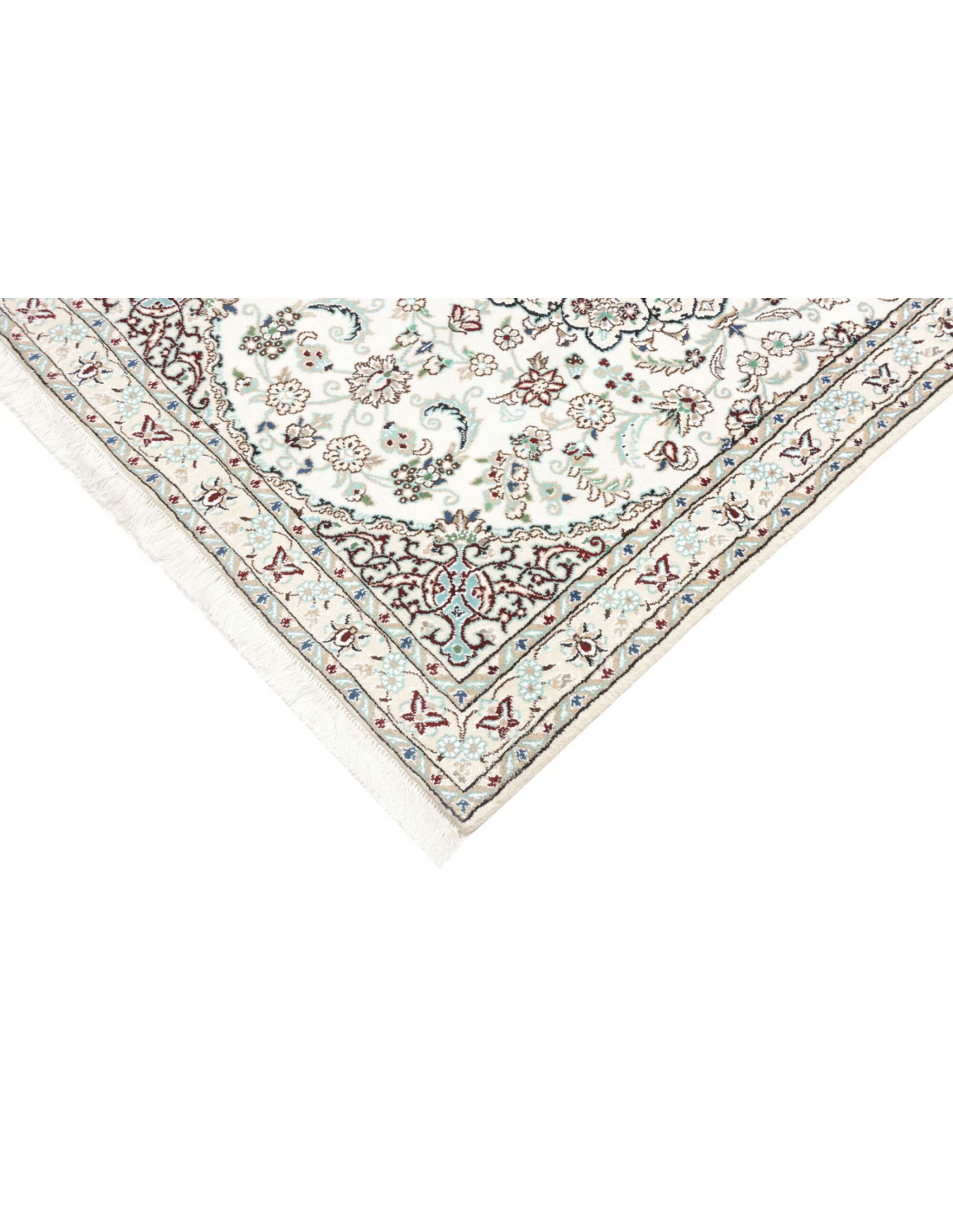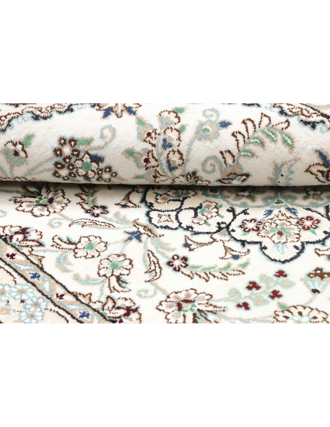 Aesthetically, Nain 9La rugs are characterized by their delicate floral motifs and arabesques, often arranged around a central medallion and framed by harmonious borders. Their dominant palette includes refined shades of ivory, beige, and blue, with soft contrasts that give the rug a luminous and elegant appearance. The term “9La” refers to the use of slightly thicker threads compared to Nain 6La rugs, ensuring outstanding quality while offering a more accessible option, without sacrificing timeless beauty.
