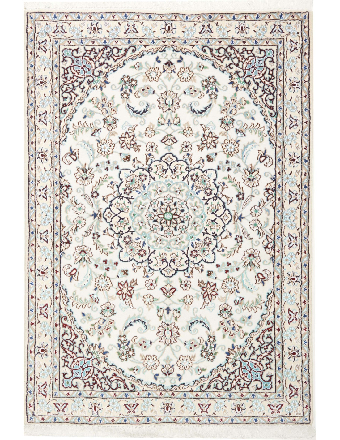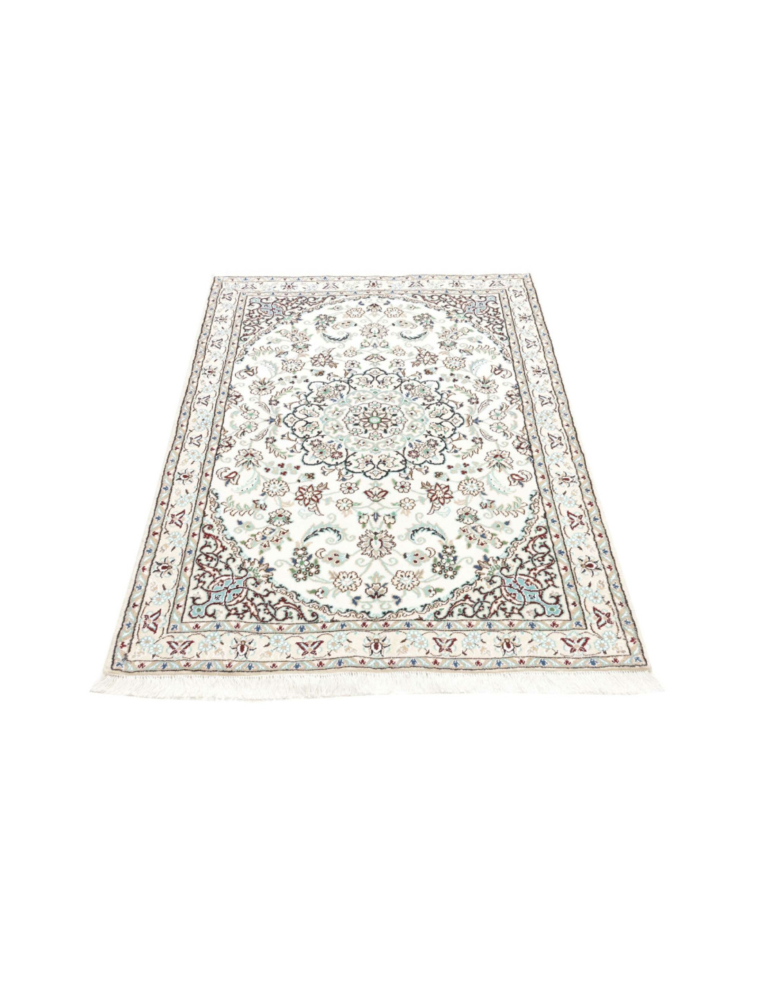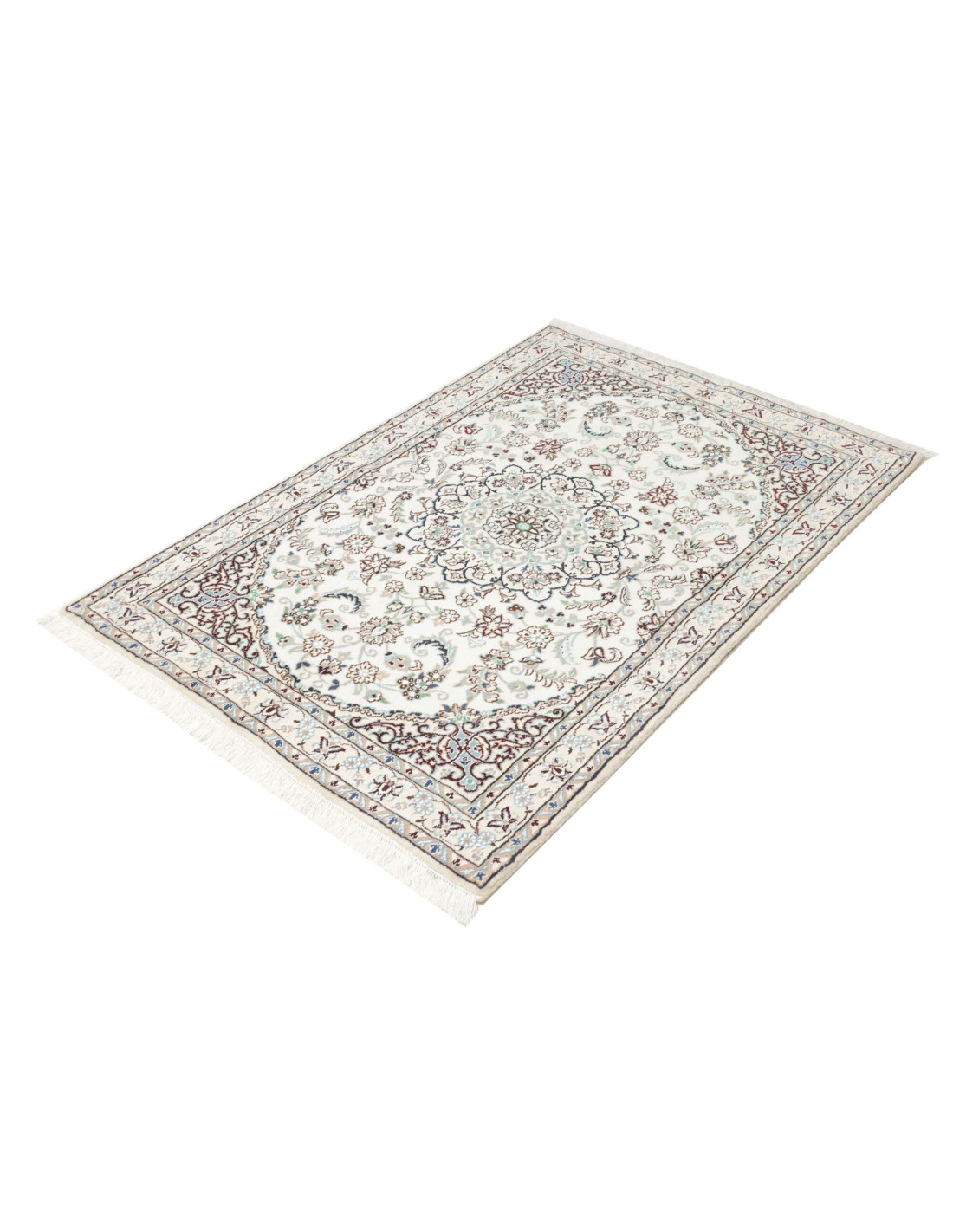 Aesthetically, Nain 9La rugs are characterized by their delicate floral motifs and arabesques, often arranged around a central medallion and framed by harmonious borders. Their dominant palette includes refined shades of ivory, beige, and blue, with soft contrasts that give the rug a luminous and elegant appearance. The term “9La” refers to the use of slightly thicker threads compared to Nain 6La rugs, ensuring outstanding quality while offering a more accessible option, without sacrificing timeless beauty.
