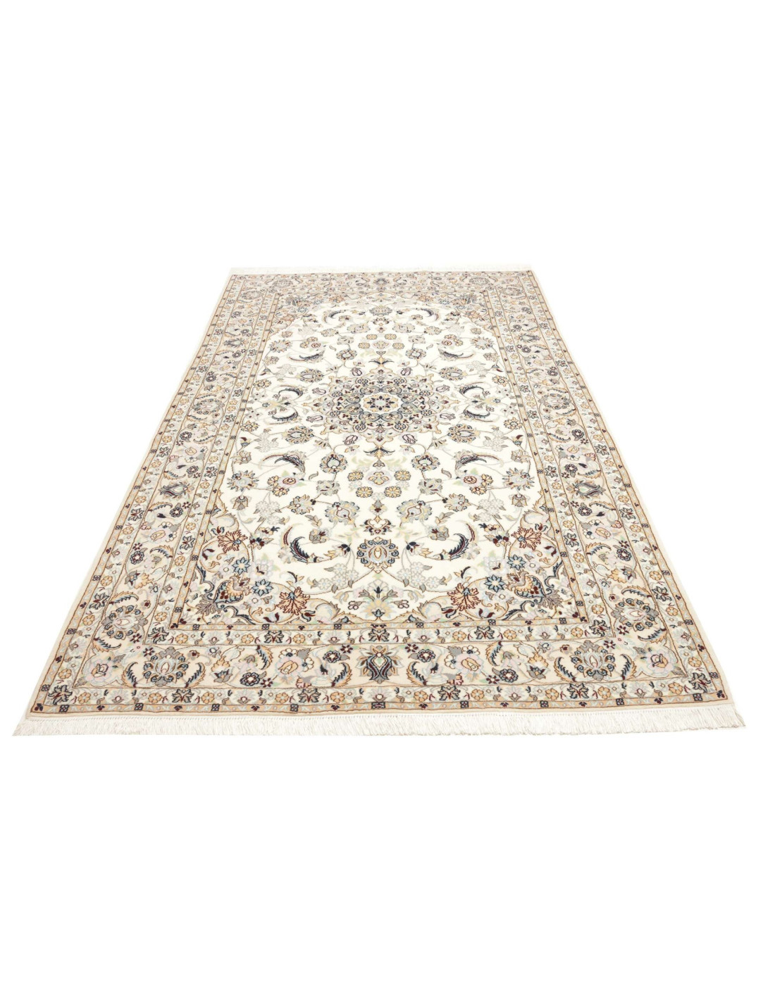 Aesthetically, Nain 9La rugs are characterized by their delicate floral motifs and arabesques, often arranged around a central medallion and framed by harmonious borders. Their dominant palette includes refined shades of ivory, beige, and blue, with soft contrasts that give the rug a luminous and elegant appearance. The term “9La” refers to the use of slightly thicker threads compared to Nain 6La rugs, ensuring outstanding quality while offering a more accessible option, without sacrificing timeless beauty.