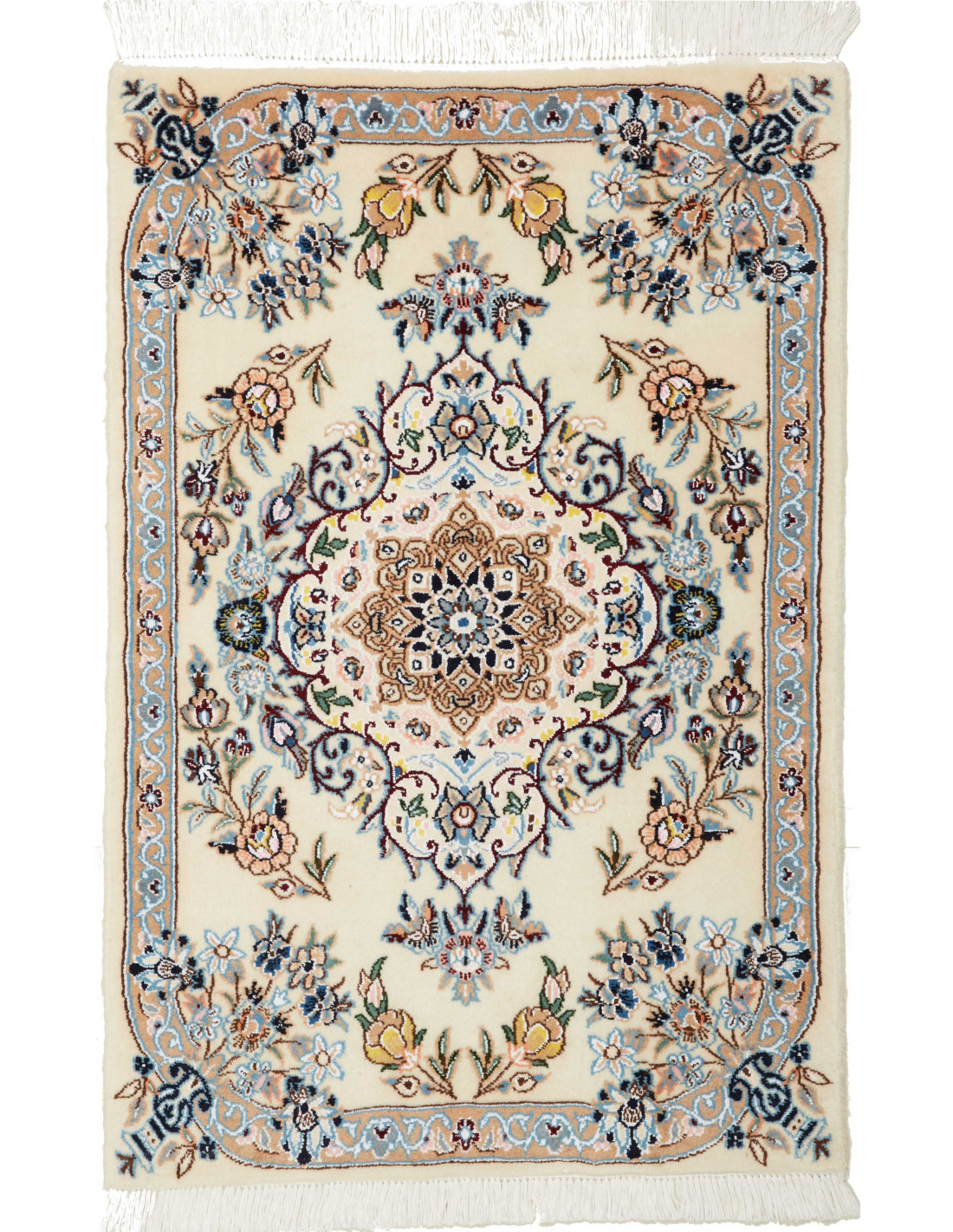 Aesthetically, Nain 9La rugs are characterized by their delicate floral motifs and arabesques, often arranged around a central medallion and framed by harmonious borders. Their dominant palette includes refined shades of ivory, beige, and blue, with soft contrasts that give the rug a luminous and elegant appearance. The term “9La” refers to the use of slightly thicker threads compared to Nain 6La rugs, ensuring outstanding quality while offering a more accessible option, without sacrificing timeless beauty.