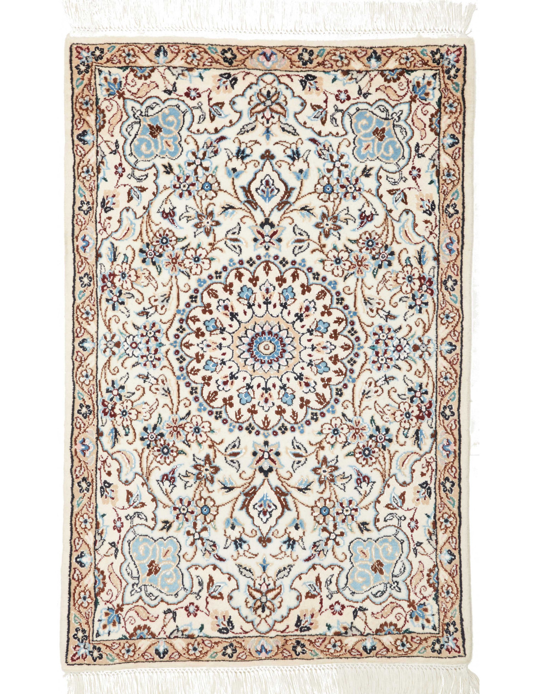 Aesthetically, Nain 9La rugs are characterized by their delicate floral motifs and arabesques, often arranged around a central medallion and framed by harmonious borders. Their dominant palette includes refined shades of ivory, beige, and blue, with soft contrasts that give the rug a luminous and elegant appearance. The term “9La” refers to the use of slightly thicker threads compared to Nain 6La rugs, ensuring outstanding quality while offering a more accessible option, without sacrificing timeless beauty.