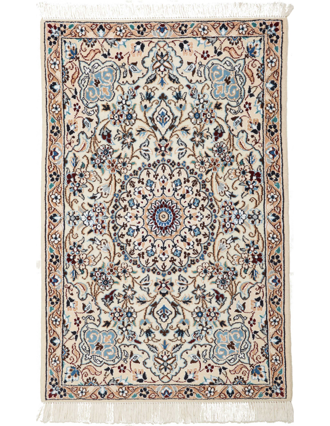 Aesthetically, Nain 9La rugs are characterized by their delicate floral motifs and arabesques, often arranged around a central medallion and framed by harmonious borders. Their dominant palette includes refined shades of ivory, beige, and blue, with soft contrasts that give the rug a luminous and elegant appearance. The term “9La” refers to the use of slightly thicker threads compared to Nain 6La rugs, ensuring outstanding quality while offering a more accessible option, without sacrificing timeless beauty.