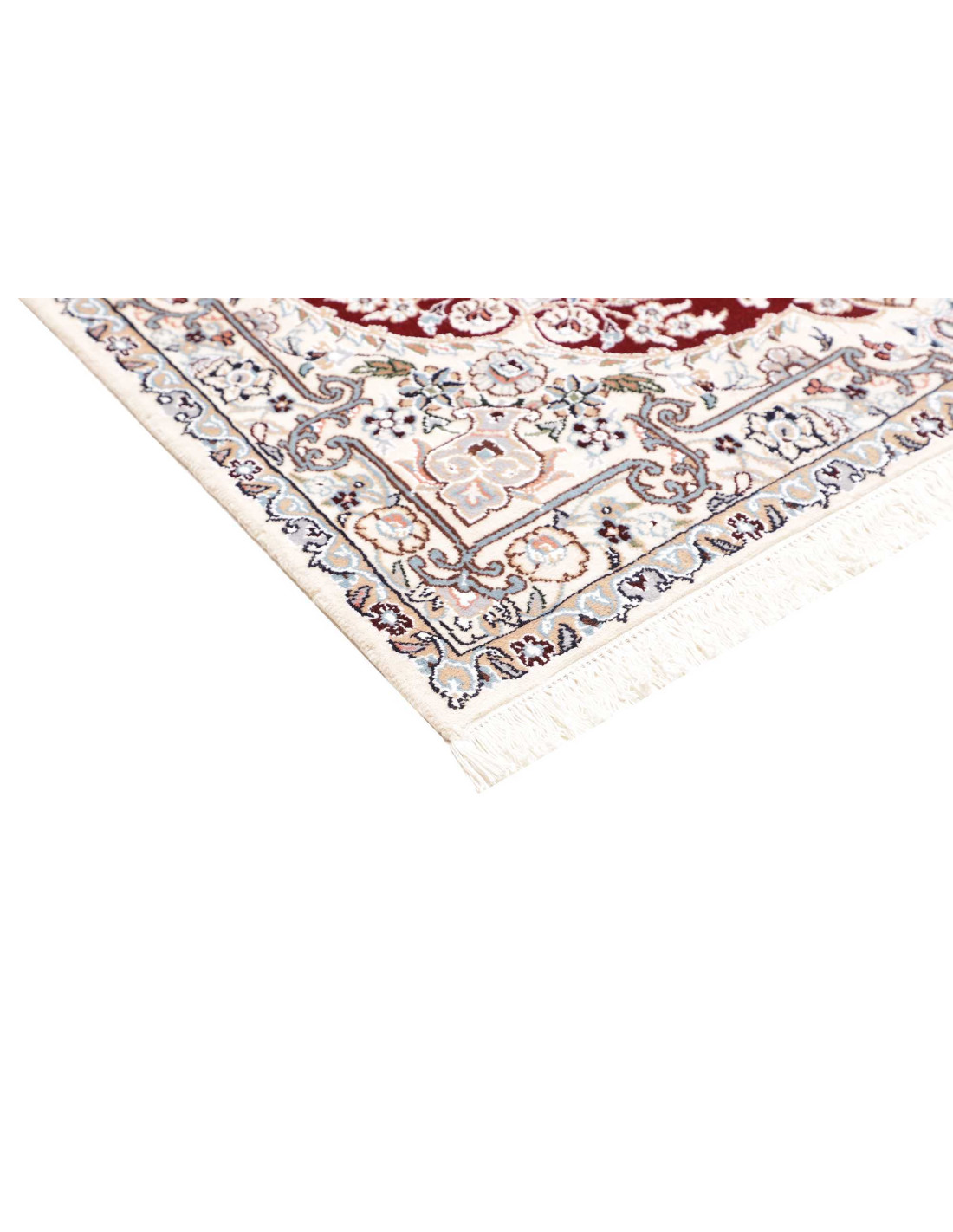Aesthetically, Nain 9La rugs are characterized by their delicate floral motifs and arabesques, often arranged around a central medallion and framed by harmonious borders. Their dominant palette includes refined shades of ivory, beige, and blue, with soft contrasts that give the rug a luminous and elegant appearance. The term “9La” refers to the use of slightly thicker threads compared to Nain 6La rugs, ensuring outstanding quality while offering a more accessible option, without sacrificing timeless beauty.
