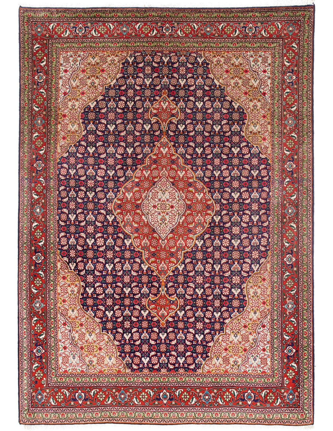 Tabriz 40 Raj rugs are admired for their complex and harmonious designs, often featuring richly decorated central medallions, floral arabesques, pictorial scenes, and highly detailed borders. Their dominant colors include red, blue, ivory, and green, sometimes enriched with golden or beige accents that add brightness and elegance. Their very high knot density allows for extraordinary definition, comparable to a painting on fabric.
