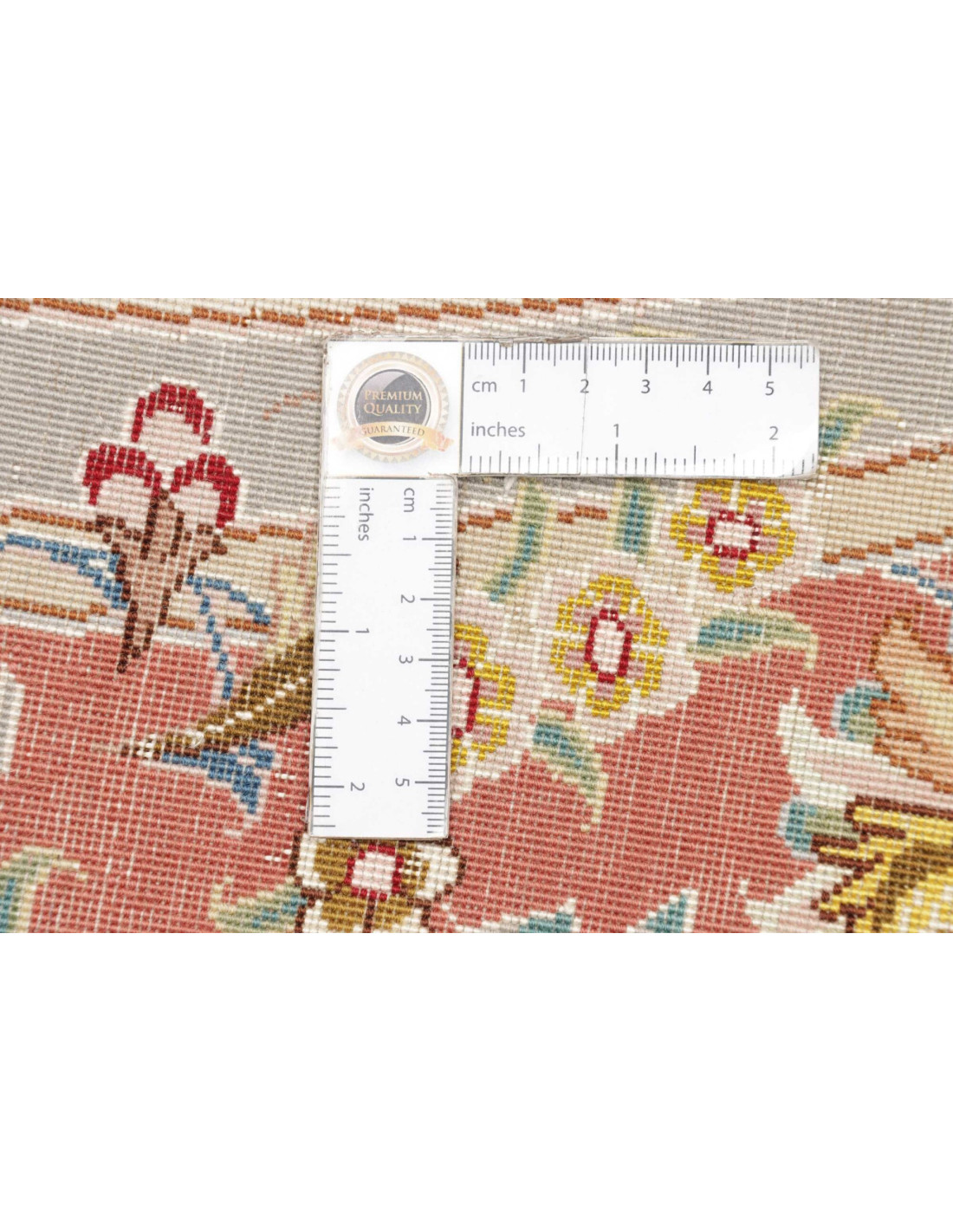 Tabriz 50 Raj rugs are admired for their extremely intricate and detailed motifs: elaborate central medallions, floral arabesques, richly decorated borders, and sometimes pictorial scenes inspired by poetry and nature. Common colors include red, blue, ivory, and green, enhanced by silk highlights that add extraordinary brightness and depth. Their very high knot density allows for astonishing precision in design, making them comparable to true works of art.