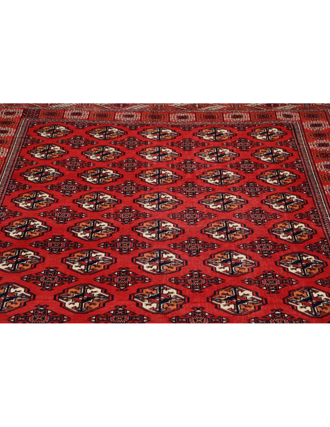 Esteticamente, i tappeti Torkaman si distinguono per i motivi geometrici ripetuti, come l’iconico “Gul” (ottagono stilizzato) che si distribuisce in sequenze ordinate sul campo del tappeto. La tavolozza cromatica tipica include tonalità calde e intense: rosso scuro, marrone, blu notte e avorio, con combinazioni che trasmettono calore e armonia. La loro struttura compatta e la resistenza dei materiali li rendono adatti non solo a spazi tradizionali, ma anche a interni moderni che cercano un tocco etnico e autentico.