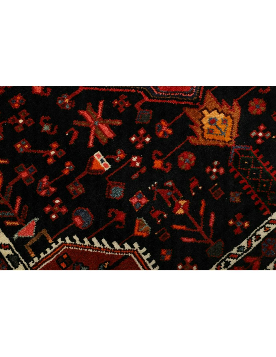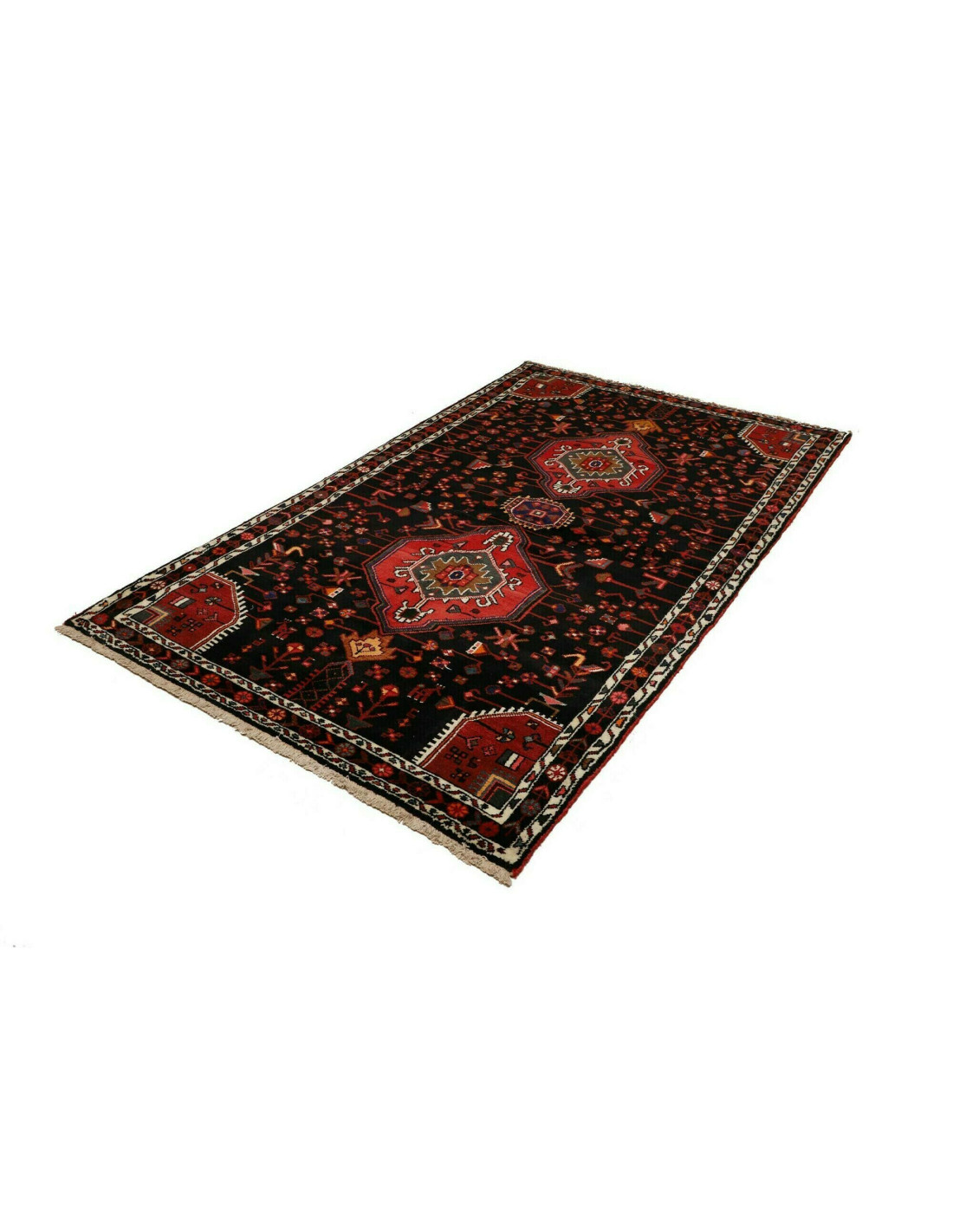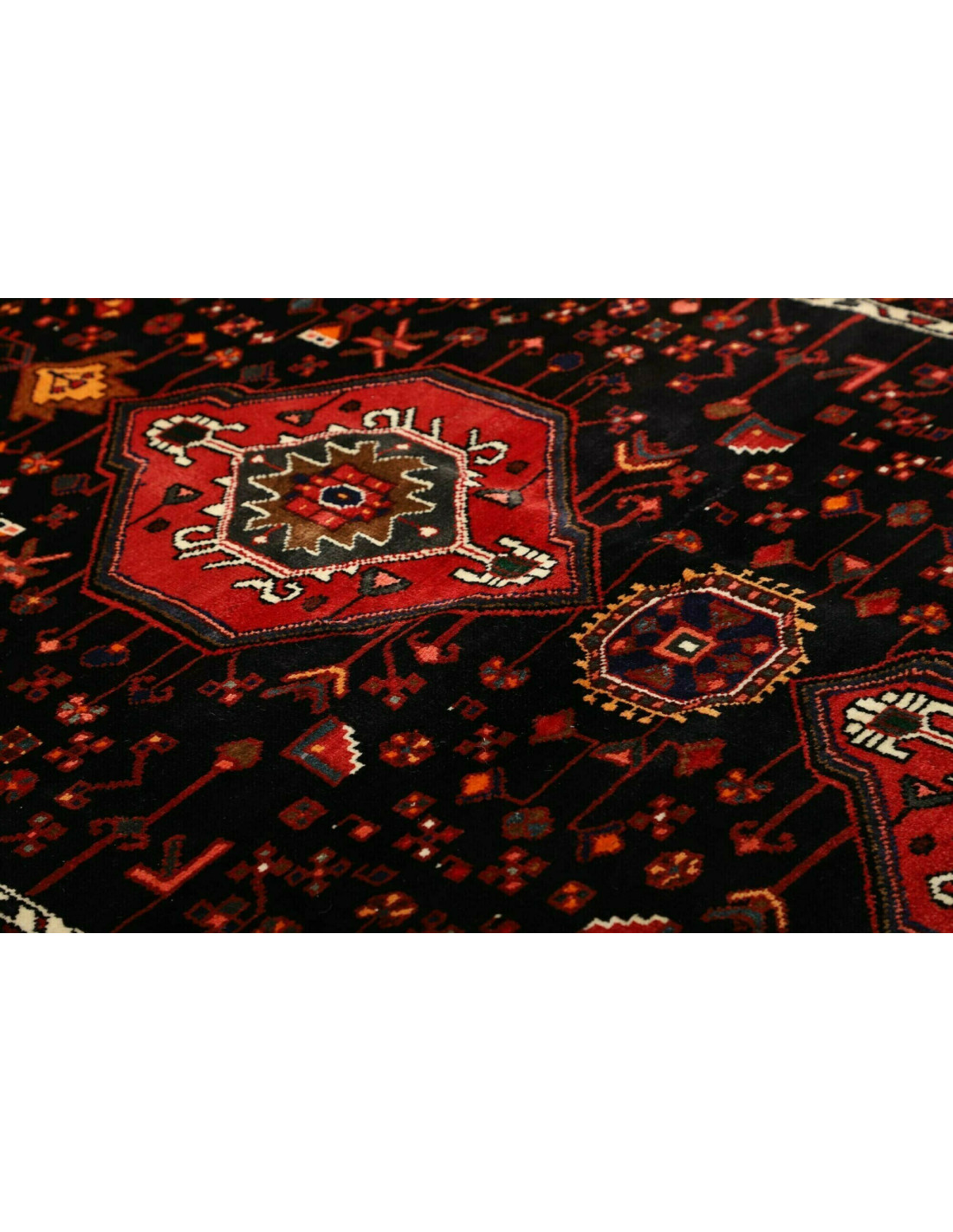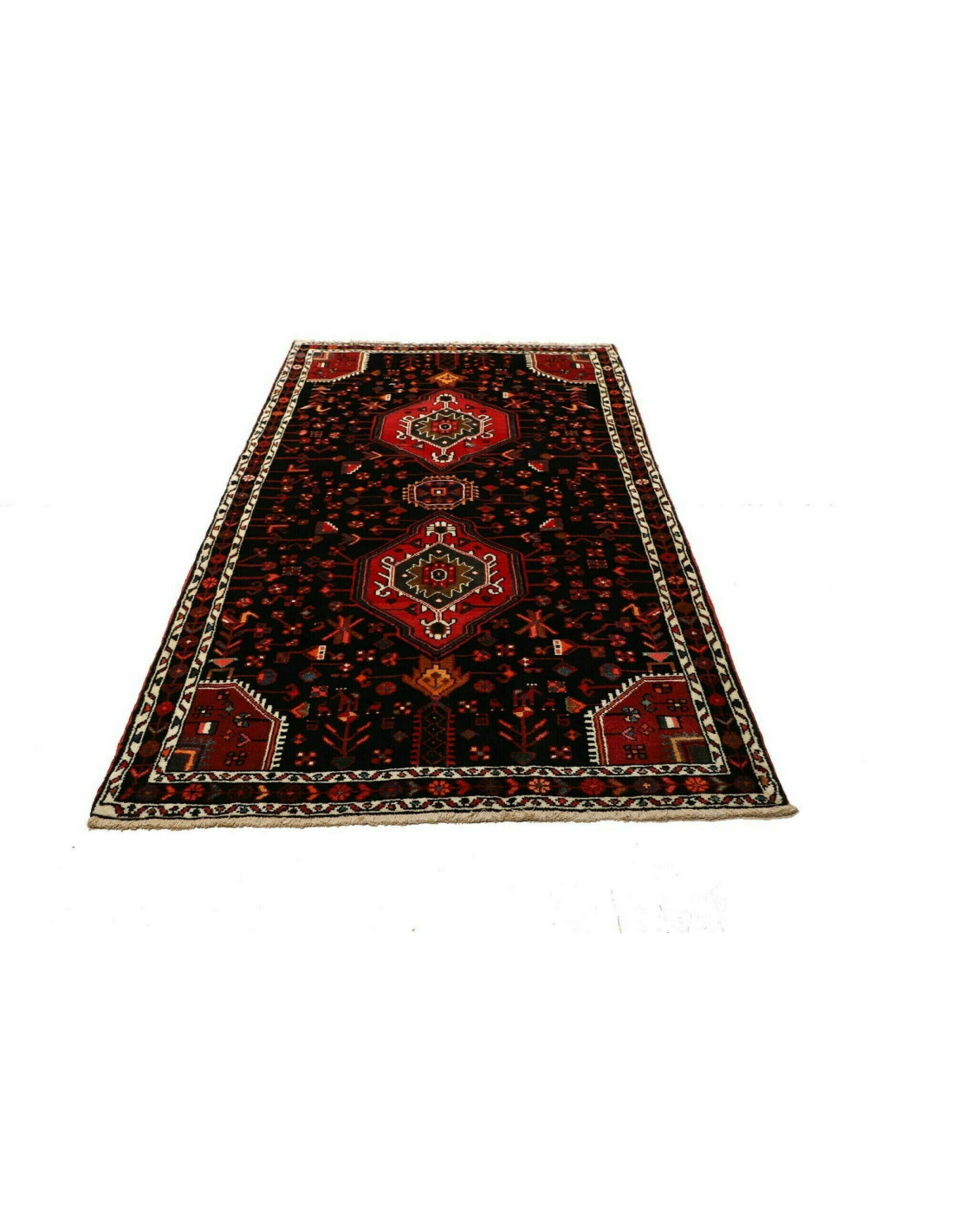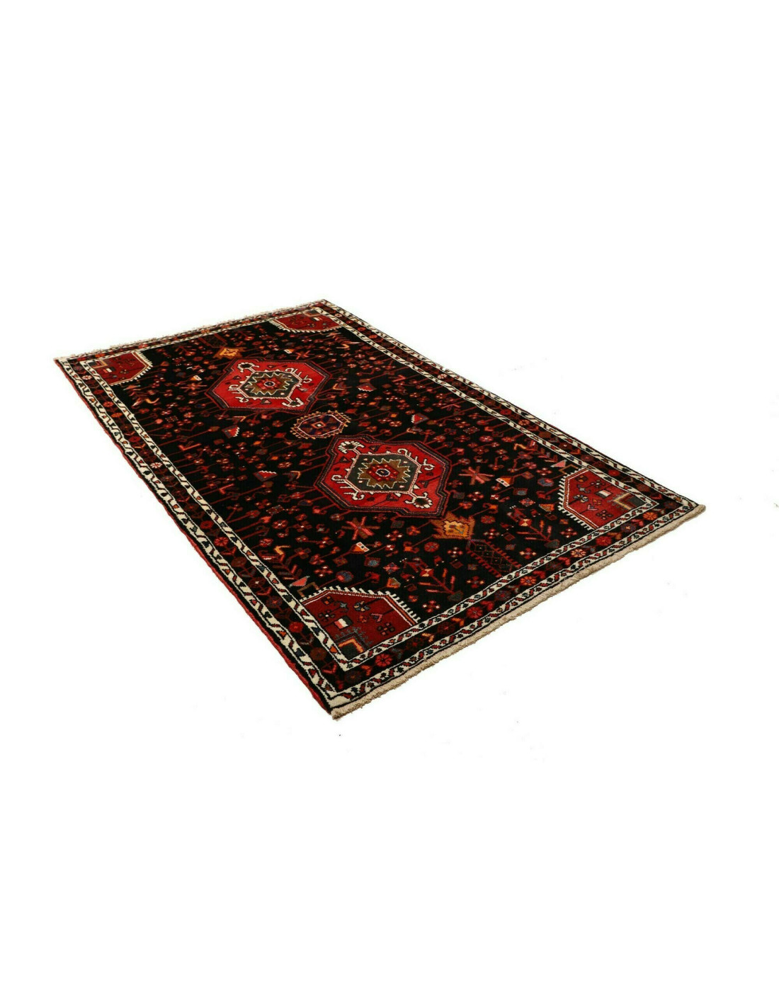 I tappeti Hamadan sono prodotti non solo in città ma anche nei numerosi villaggi circostanti, il che spiega la grande varietà di disegni che li caratterizza. Tra i motivi più comuni troviamo medaglioni centrali, disegni geometrici e motivi floreali stilizzati. I colori dominanti sono il rosso, il blu e l’avorio, sempre vivaci grazie alle tinture naturali. La trama solida e l’annodatura robusta li rendono tappeti versatili, adatti a molteplici contesti d’arredo.