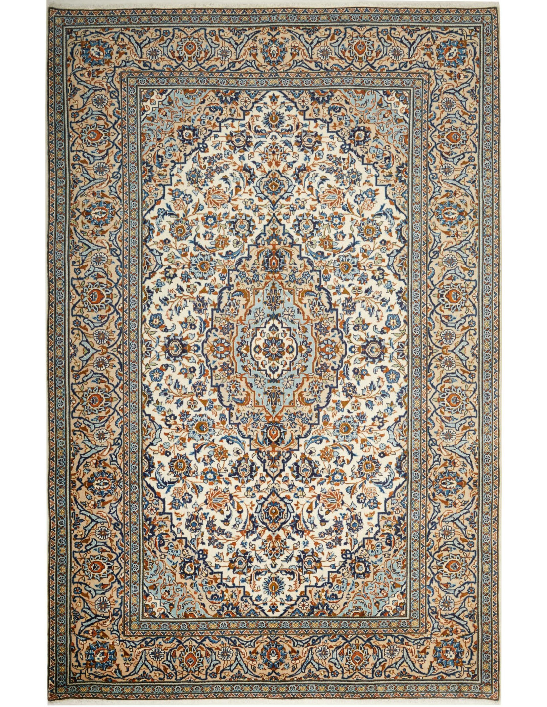 Dal punto di vista estetico, i tappeti Kashan sono celebri per i motivi floreali ricchi e raffinati, i medaglioni centrali armoniosi e le cornici elaborate. I colori predominanti sono il rosso rubino, il blu intenso e l’avorio, combinati per creare tappeti eleganti e luminosi, capaci di valorizzare qualsiasi ambiente, dal classico al moderno. La densità dell’annodatura conferisce ai disegni una precisione straordinaria, rendendo ogni tappeto un vero e proprio capolavoro tessile.