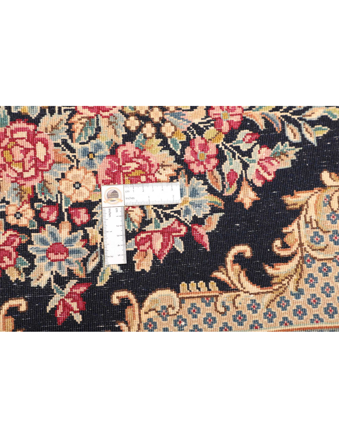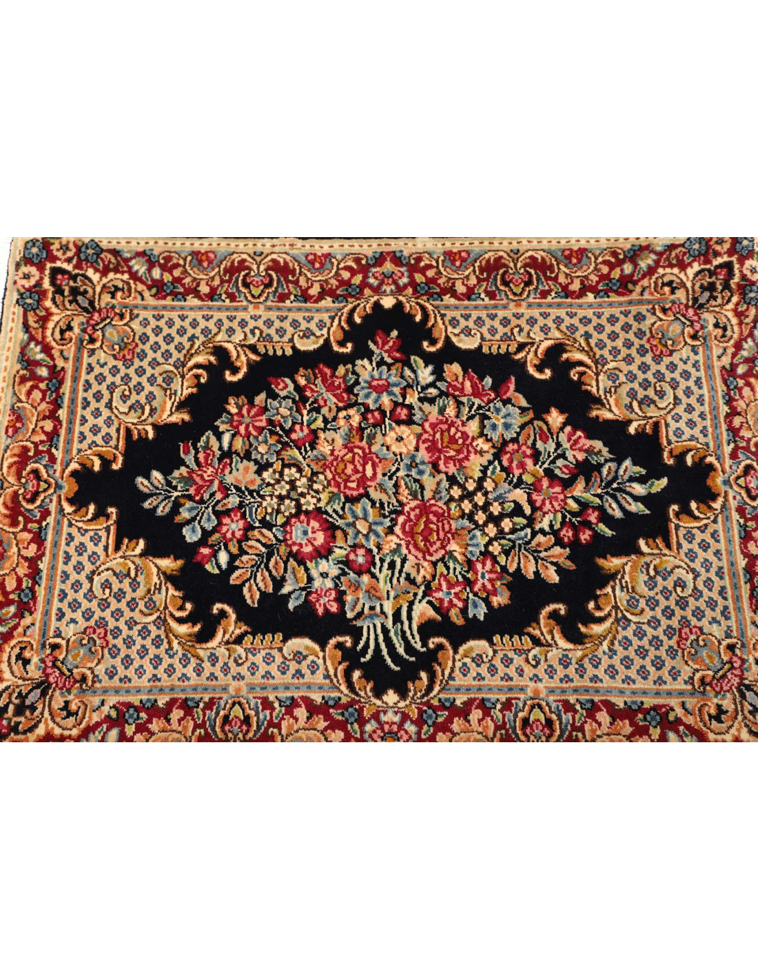 I tappeti Kerman sono celebri per i loro motivi floreali ricchissimi, spesso caratterizzati da medaglioni centrali, bouquet di fiori e cornici finemente decorate. La tavolozza cromatica è vasta e sofisticata: rosso, blu, verde, avorio e tonalità pastello vengono armonizzati con grande maestria, creando tappeti dall’aspetto elegante e luminoso. La densità elevata dell’annodatura consente di realizzare disegni molto dettagliati, che fanno dei Kerman dei veri e propri capolavori tessili.