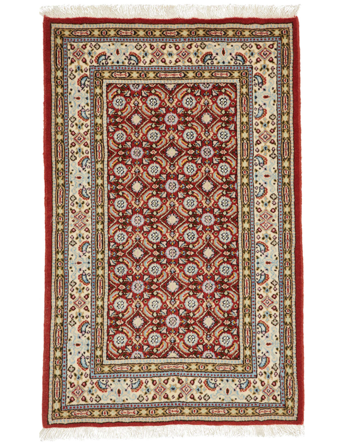 Dal punto di vista estetico, i tappeti Moud si distinguono per i loro motivi floreali e geometrici raffinati, spesso organizzati attorno a un medaglione centrale o ripetuti in un disegno a campo pieno (noti come “Herati”). Le tonalità più comuni includono blu, rosso e avorio, spesso combinate con beige e marrone chiaro per creare un equilibrio cromatico elegante e luminoso. Grazie all’alta densità dei nodi, i disegni appaiono definiti e ricchi di dettagli, rendendo questi tappeti molto apprezzati sia in contesti classici che moderni.