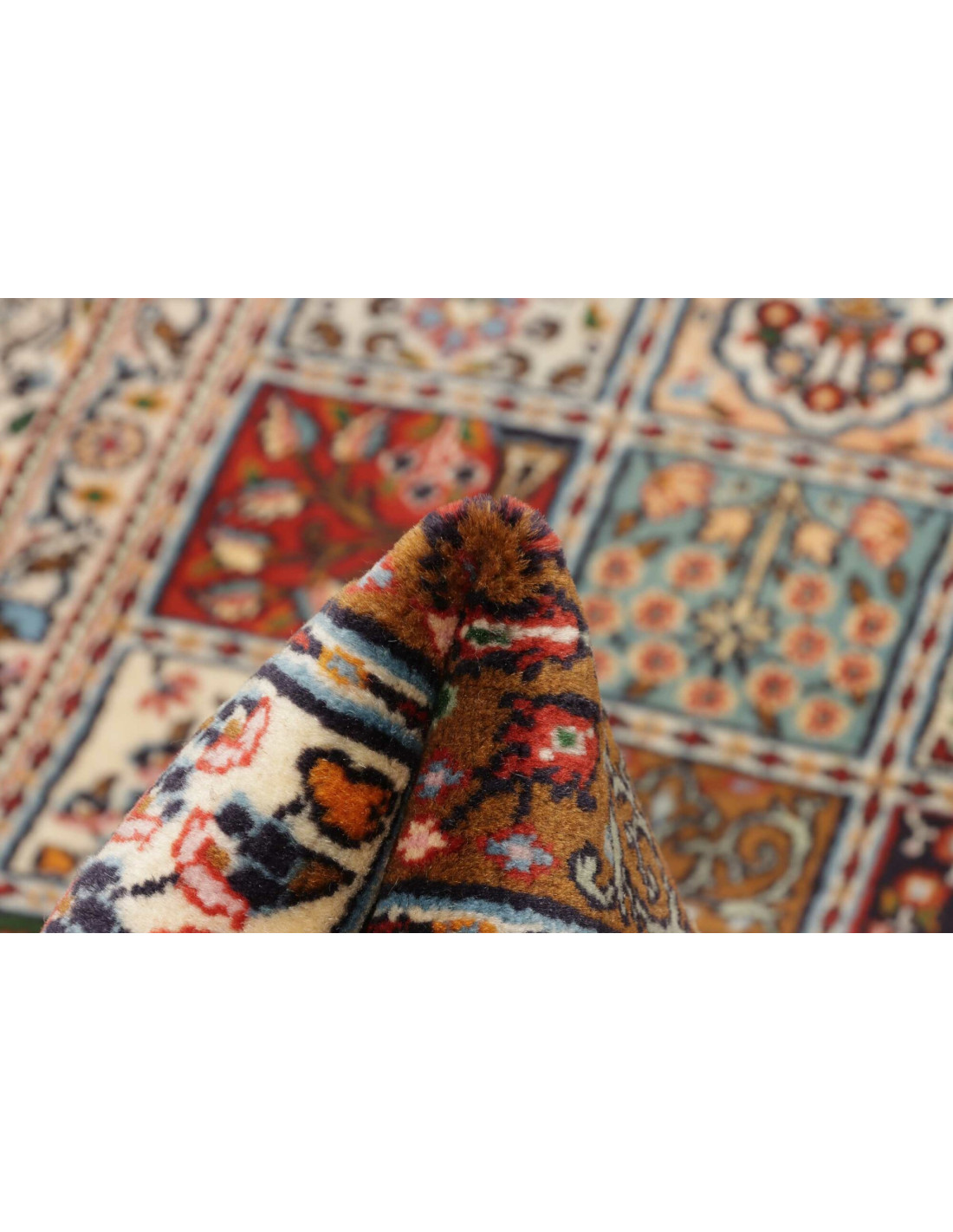 Dal punto di vista estetico, i tappeti Moud si distinguono per i loro motivi floreali e geometrici raffinati, spesso organizzati attorno a un medaglione centrale o ripetuti in un disegno a campo pieno (noti come “Herati”). Le tonalità più comuni includono blu, rosso e avorio, spesso combinate con beige e marrone chiaro per creare un equilibrio cromatico elegante e luminoso. Grazie all’alta densità dei nodi, i disegni appaiono definiti e ricchi di dettagli, rendendo questi tappeti molto apprezzati sia in contesti classici che moderni.