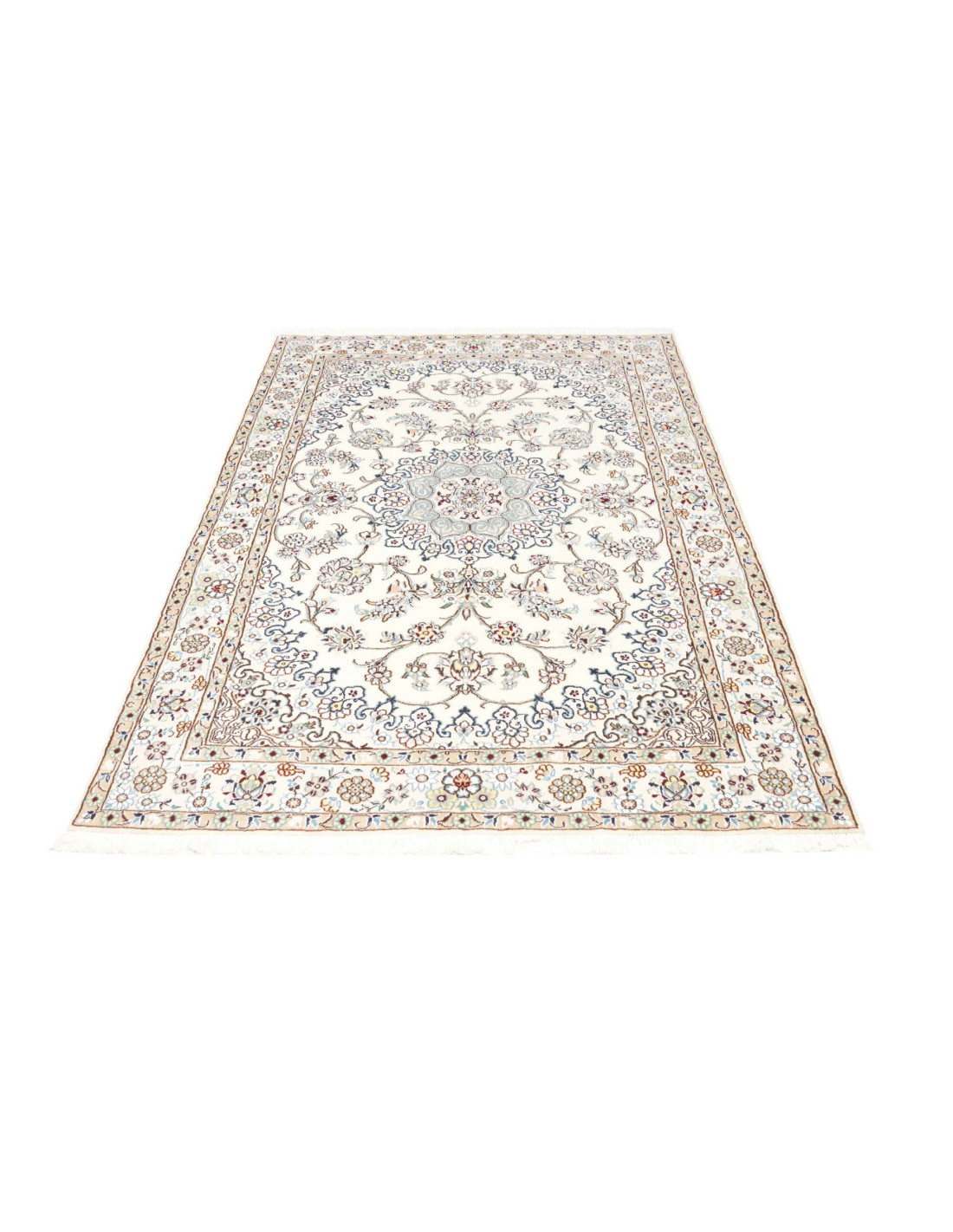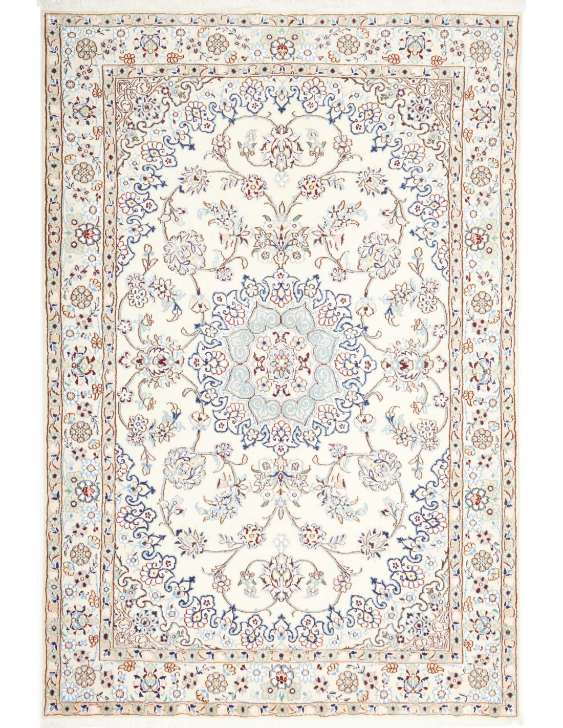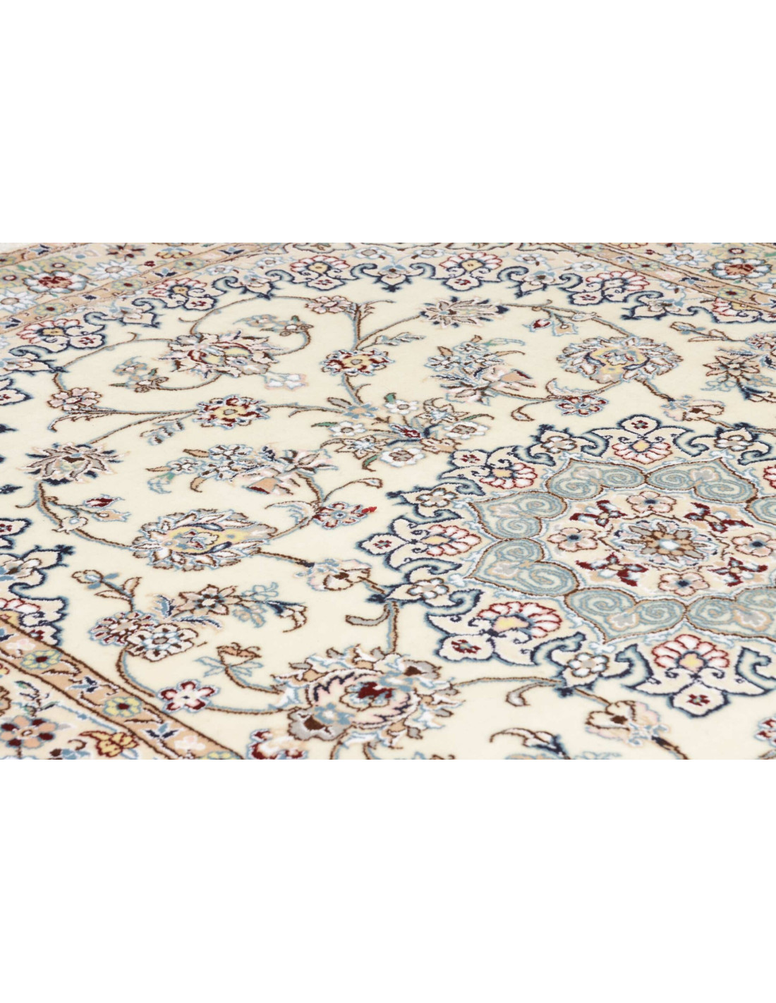Dal punto di vista estetico, i tappeti Nain 9La si distinguono per i loro motivi floreali e arabeschi delicati, spesso organizzati intorno a un medaglione centrale e arricchiti da cornici armoniose. I colori predominanti sono tonalità raffinate come avorio, beige e blu, con contrasti delicati che conferiscono al tappeto un aspetto luminoso ed elegante. La dicitura “9La” indica l’uso di filati leggermente più spessi rispetto ai Nain 6La, garantendo comunque un’altissima qualità ma con un costo più accessibile, mantenendo lo stesso fascino intramontabile.