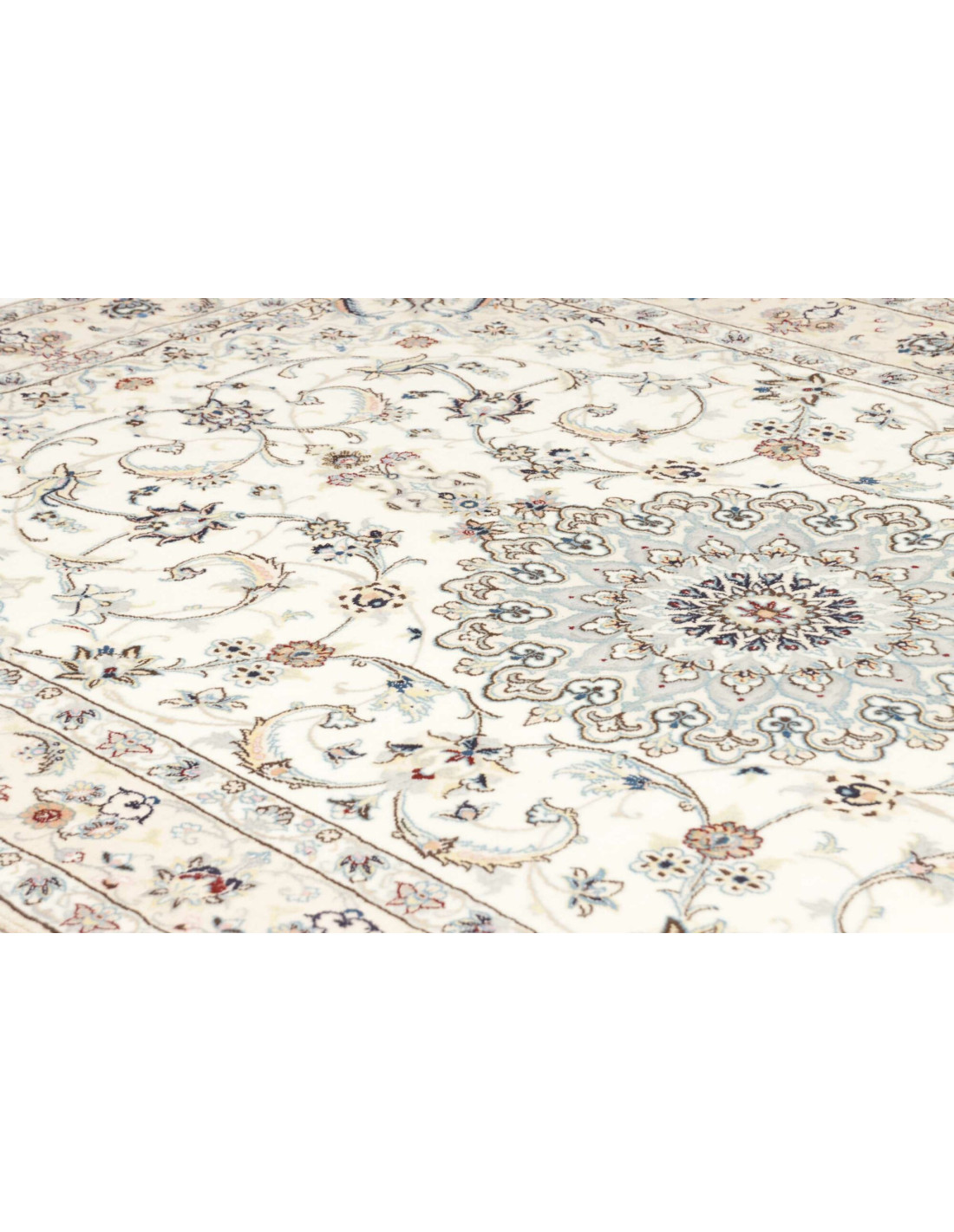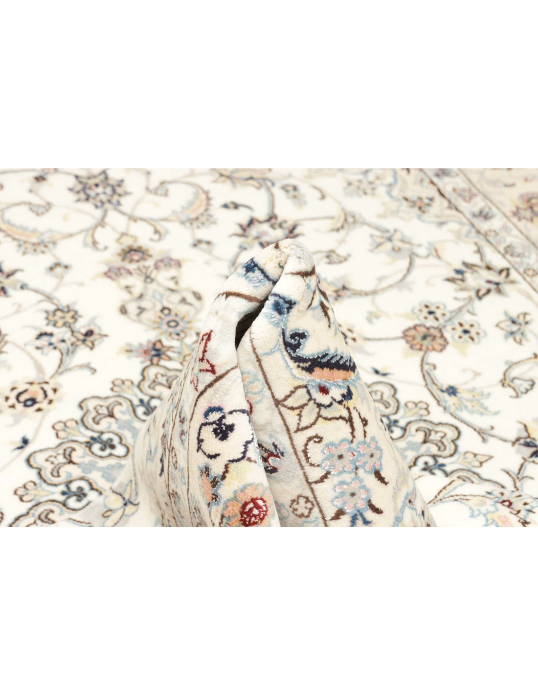 Dal punto di vista estetico, i tappeti Nain 9La si distinguono per i loro motivi floreali e arabeschi delicati, spesso organizzati intorno a un medaglione centrale e arricchiti da cornici armoniose. I colori predominanti sono tonalità raffinate come avorio, beige e blu, con contrasti delicati che conferiscono al tappeto un aspetto luminoso ed elegante. La dicitura “9La” indica l’uso di filati leggermente più spessi rispetto ai Nain 6La, garantendo comunque un’altissima qualità ma con un costo più accessibile, mantenendo lo stesso fascino intramontabile.
