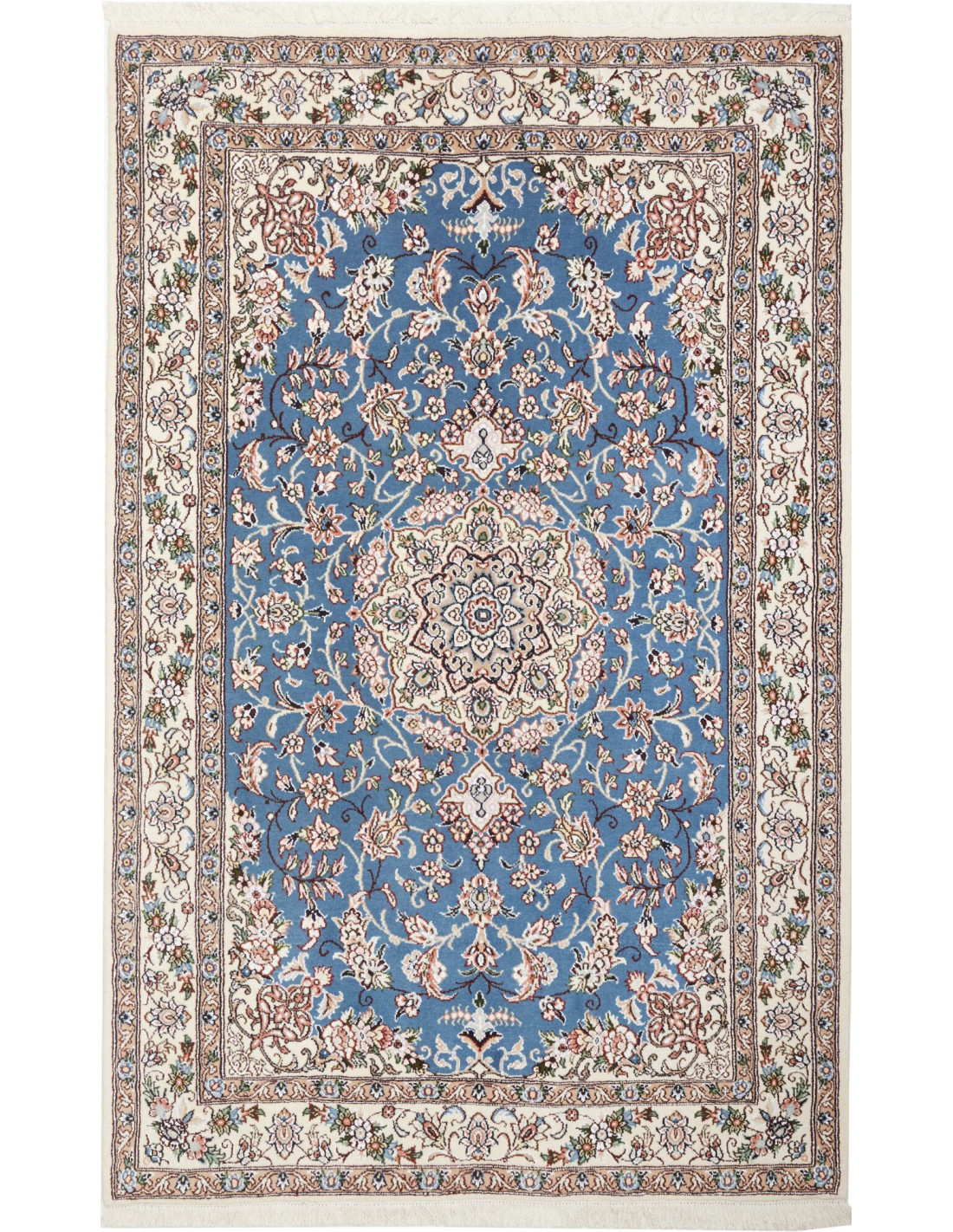 Dal punto di vista estetico, i tappeti Nain 9La si distinguono per i loro motivi floreali e arabeschi delicati, spesso organizzati intorno a un medaglione centrale e arricchiti da cornici armoniose. I colori predominanti sono tonalità raffinate come avorio, beige e blu, con contrasti delicati che conferiscono al tappeto un aspetto luminoso ed elegante. La dicitura “9La” indica l’uso di filati leggermente più spessi rispetto ai Nain 6La, garantendo comunque un’altissima qualità ma con un costo più accessibile, mantenendo lo stesso fascino intramontabile.