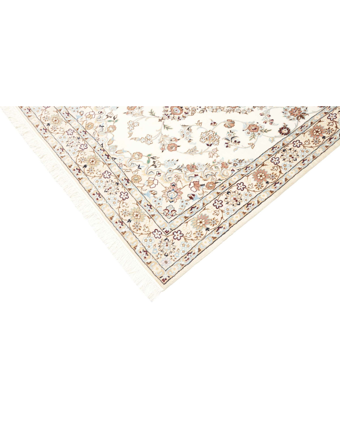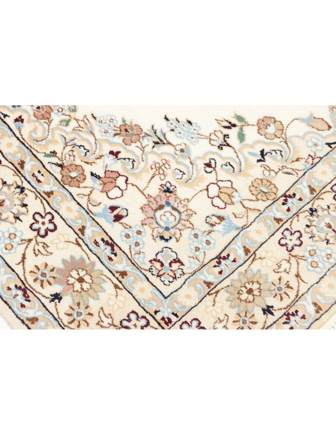 Dal punto di vista estetico, i tappeti Nain 9La si distinguono per i loro motivi floreali e arabeschi delicati, spesso organizzati intorno a un medaglione centrale e arricchiti da cornici armoniose. I colori predominanti sono tonalità raffinate come avorio, beige e blu, con contrasti delicati che conferiscono al tappeto un aspetto luminoso ed elegante. La dicitura “9La” indica l’uso di filati leggermente più spessi rispetto ai Nain 6La, garantendo comunque un’altissima qualità ma con un costo più accessibile, mantenendo lo stesso fascino intramontabile.