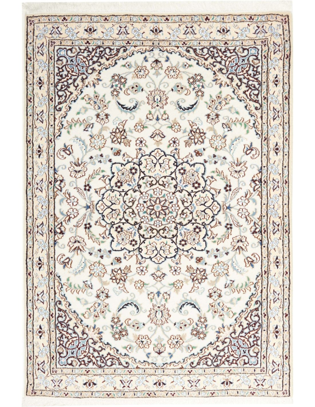 Dal punto di vista estetico, i tappeti Nain 9La si distinguono per i loro motivi floreali e arabeschi delicati, spesso organizzati intorno a un medaglione centrale e arricchiti da cornici armoniose. I colori predominanti sono tonalità raffinate come avorio, beige e blu, con contrasti delicati che conferiscono al tappeto un aspetto luminoso ed elegante. La dicitura “9La” indica l’uso di filati leggermente più spessi rispetto ai Nain 6La, garantendo comunque un’altissima qualità ma con un costo più accessibile, mantenendo lo stesso fascino intramontabile.