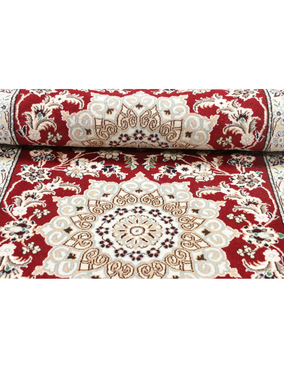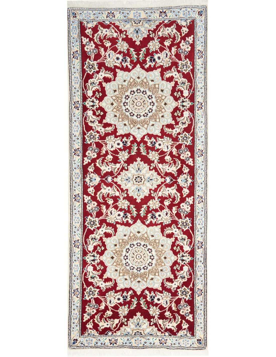 Dal punto di vista estetico, i tappeti Nain 9La si distinguono per i loro motivi floreali e arabeschi delicati, spesso organizzati intorno a un medaglione centrale e arricchiti da cornici armoniose. I colori predominanti sono tonalità raffinate come avorio, beige e blu, con contrasti delicati che conferiscono al tappeto un aspetto luminoso ed elegante. La dicitura “9La” indica l’uso di filati leggermente più spessi rispetto ai Nain 6La, garantendo comunque un’altissima qualità ma con un costo più accessibile, mantenendo lo stesso fascino intramontabile.