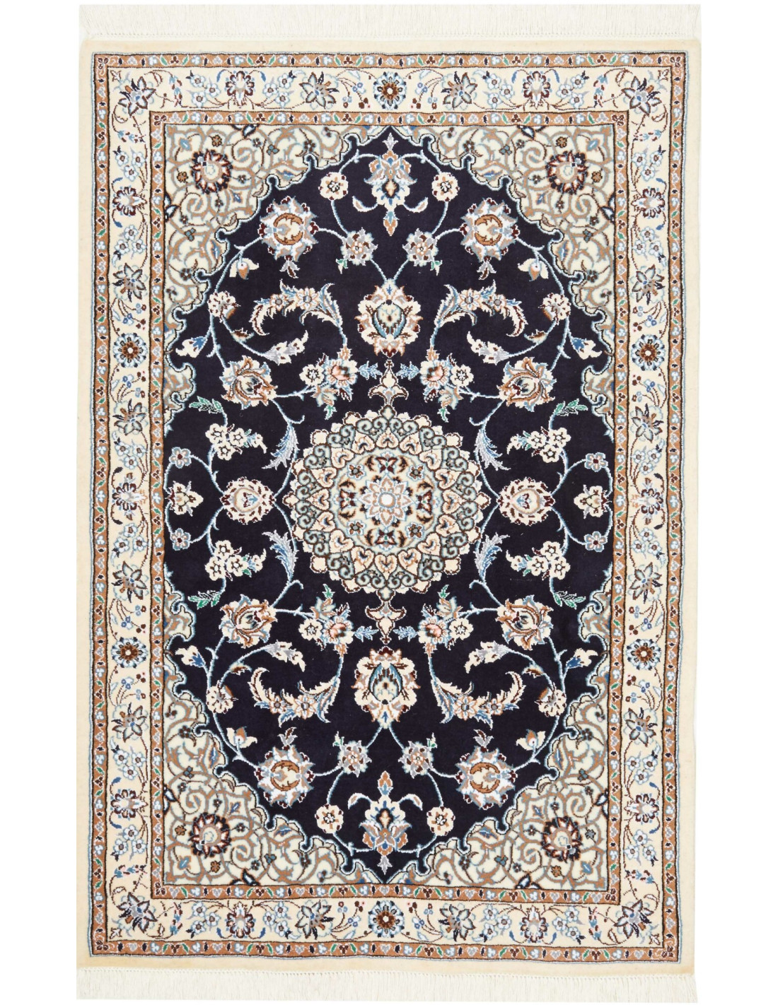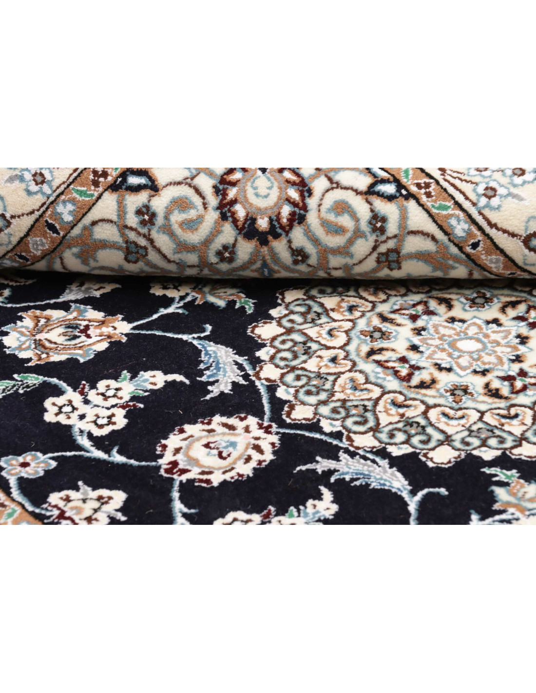 Dal punto di vista estetico, i tappeti Nain 9La si distinguono per i loro motivi floreali e arabeschi delicati, spesso organizzati intorno a un medaglione centrale e arricchiti da cornici armoniose. I colori predominanti sono tonalità raffinate come avorio, beige e blu, con contrasti delicati che conferiscono al tappeto un aspetto luminoso ed elegante. La dicitura “9La” indica l’uso di filati leggermente più spessi rispetto ai Nain 6La, garantendo comunque un’altissima qualità ma con un costo più accessibile, mantenendo lo stesso fascino intramontabile.