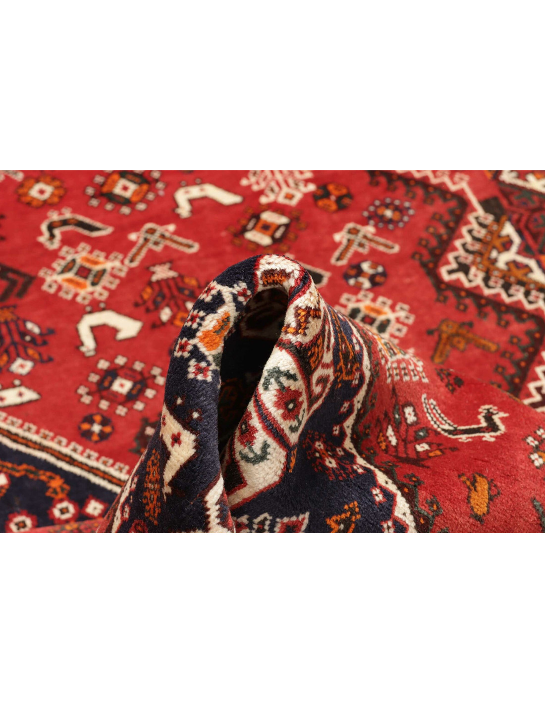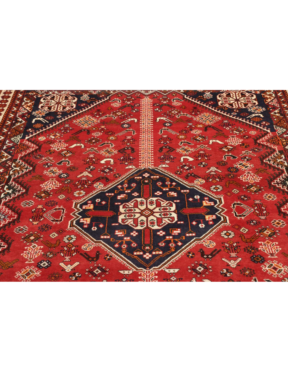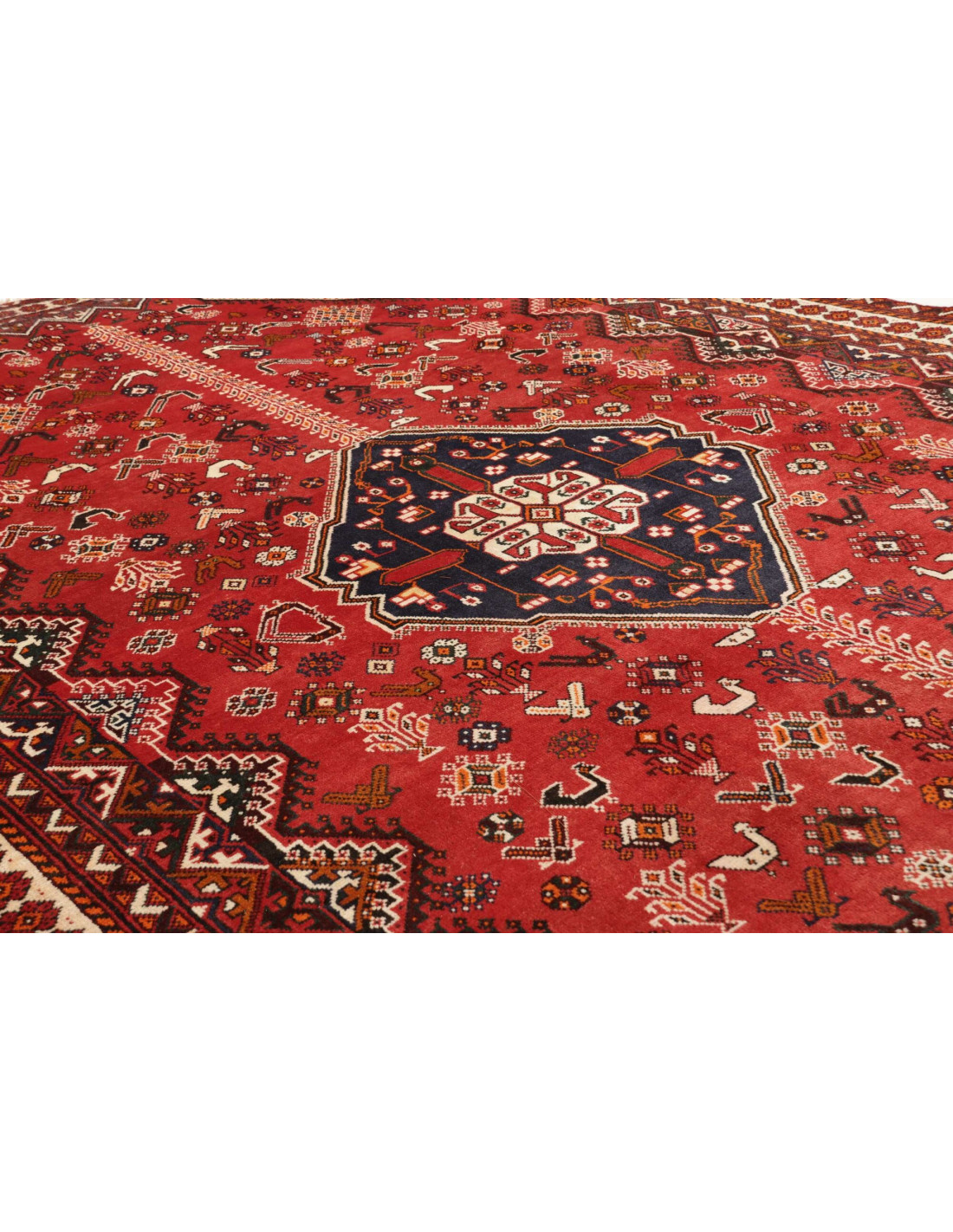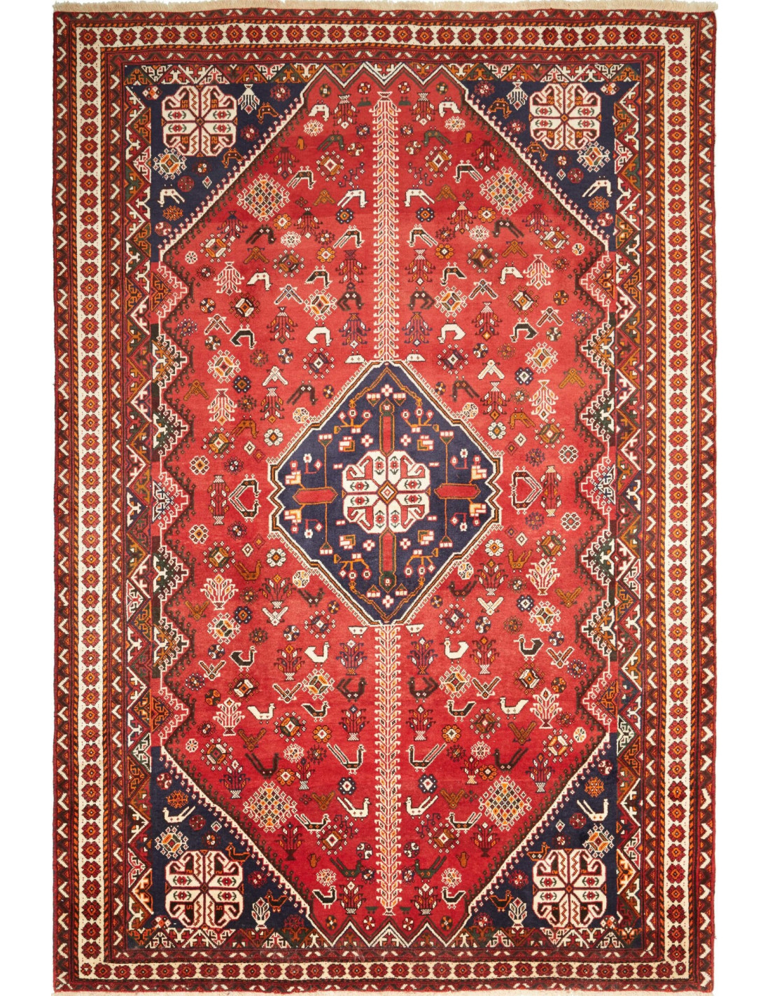Esteticamente, i tappeti Shiraz Fine si distinguono per i motivi geometrici elaborati, arricchiti da medaglioni a rombo, figure stilizzate di animali e simboli tribali reinterpretati con maggiore precisione. La gamma cromatica include rosso intenso, blu profondo, avorio e arancio, spesso armonizzati con tonalità più delicate rispetto ai tappeti Shiraz tradizionali. L’annodatura più fine permette di ottenere disegni nitidi e ben definiti, rendendo questi tappeti ideali per chi cerca autenticità ma anche eleganza formale.