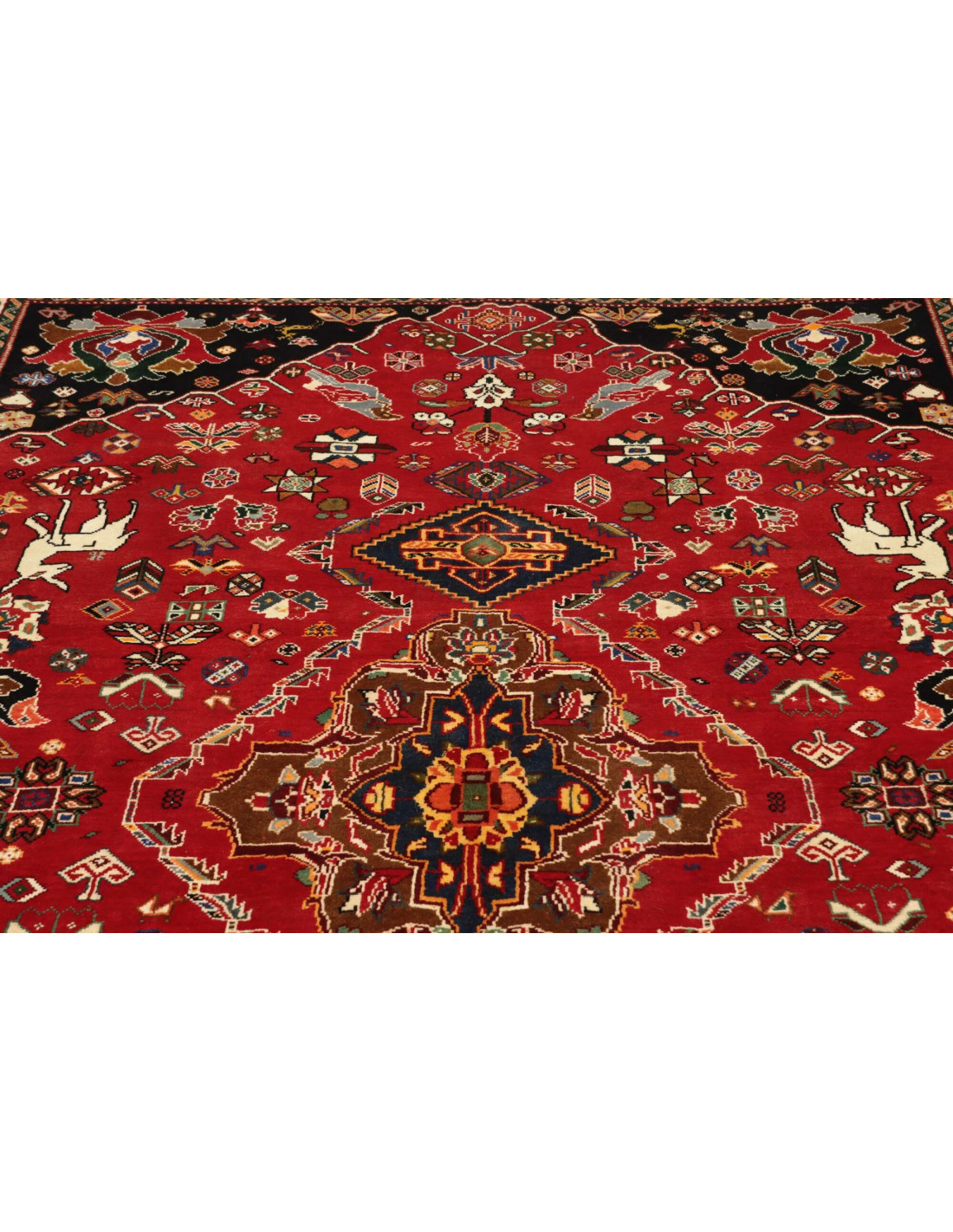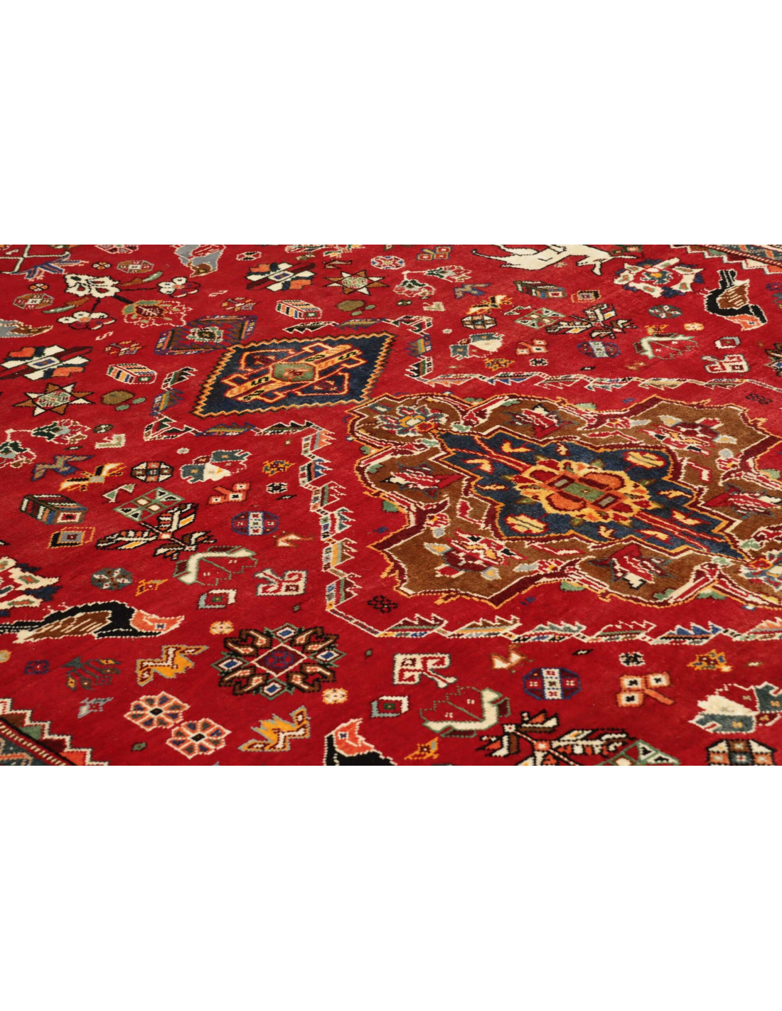 Esteticamente, i tappeti Shiraz Fine si distinguono per i motivi geometrici elaborati, arricchiti da medaglioni a rombo, figure stilizzate di animali e simboli tribali reinterpretati con maggiore precisione. La gamma cromatica include rosso intenso, blu profondo, avorio e arancio, spesso armonizzati con tonalità più delicate rispetto ai tappeti Shiraz tradizionali. L’annodatura più fine permette di ottenere disegni nitidi e ben definiti, rendendo questi tappeti ideali per chi cerca autenticità ma anche eleganza formale.