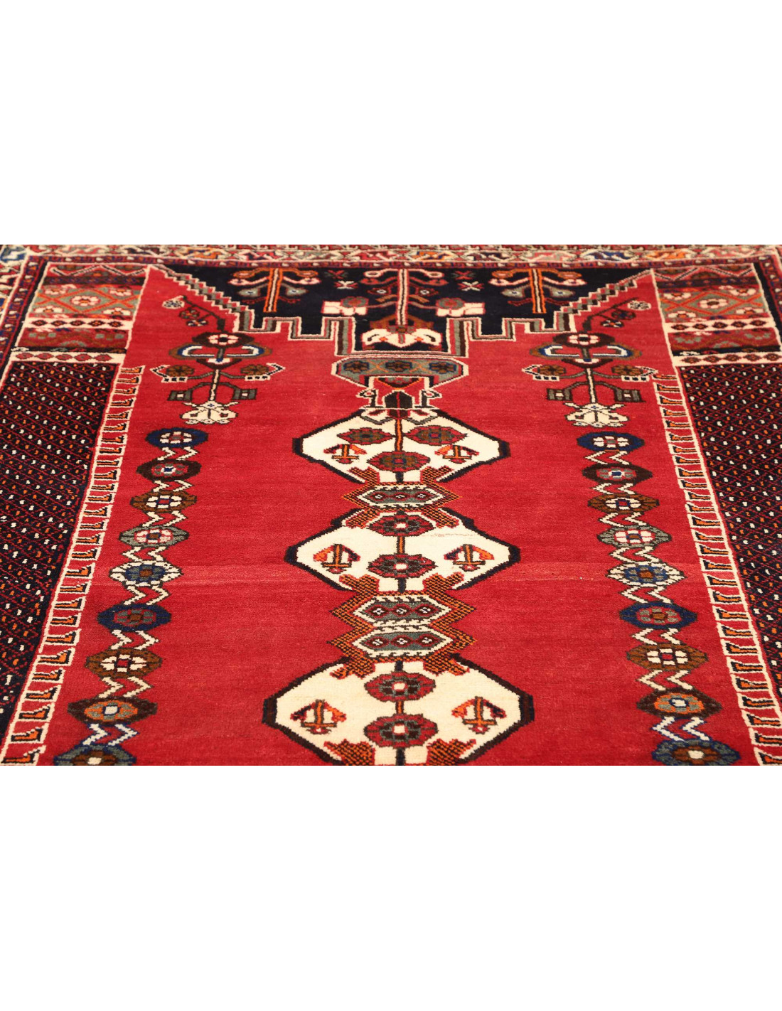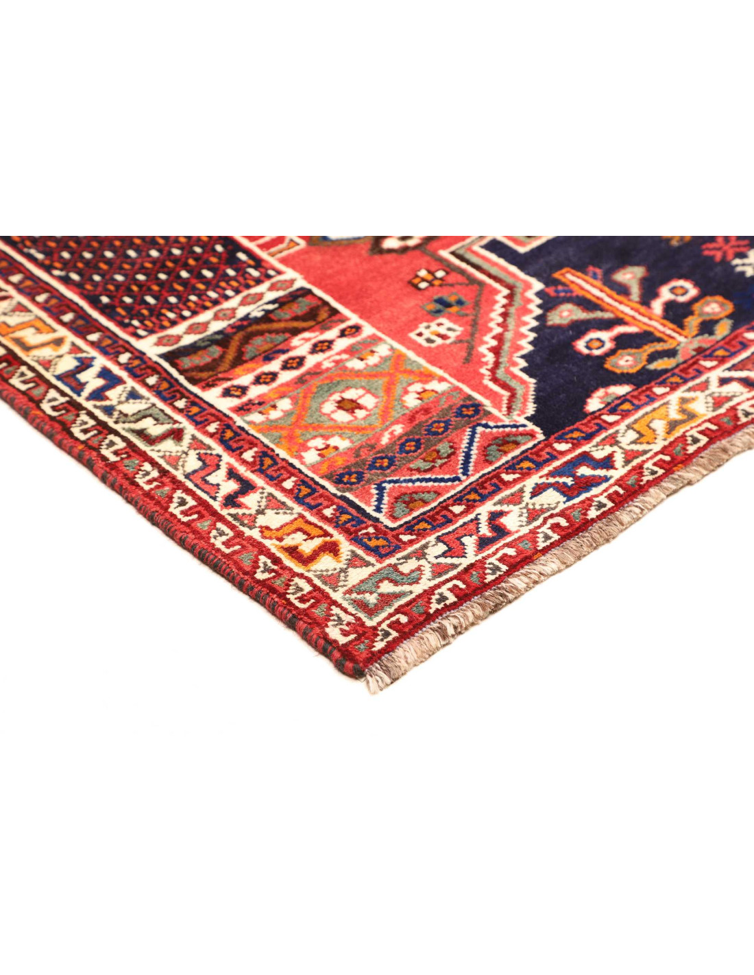 Esteticamente, i tappeti Shiraz si distinguono per i motivi geometrici audaci, spesso caratterizzati da grandi medaglioni a rombo, figure stilizzate di animali e simboli tribali. I colori predominanti includono rosso intenso, blu scuro, arancio e avorio, combinati in modo vivace e spontaneo. La loro tessitura non è fittissima come quella dei tappeti più formali, ma proprio questa caratteristica conferisce agli Shiraz un fascino autentico e genuino, ideale per chi cerca un tappeto dal carattere forte e identitario.